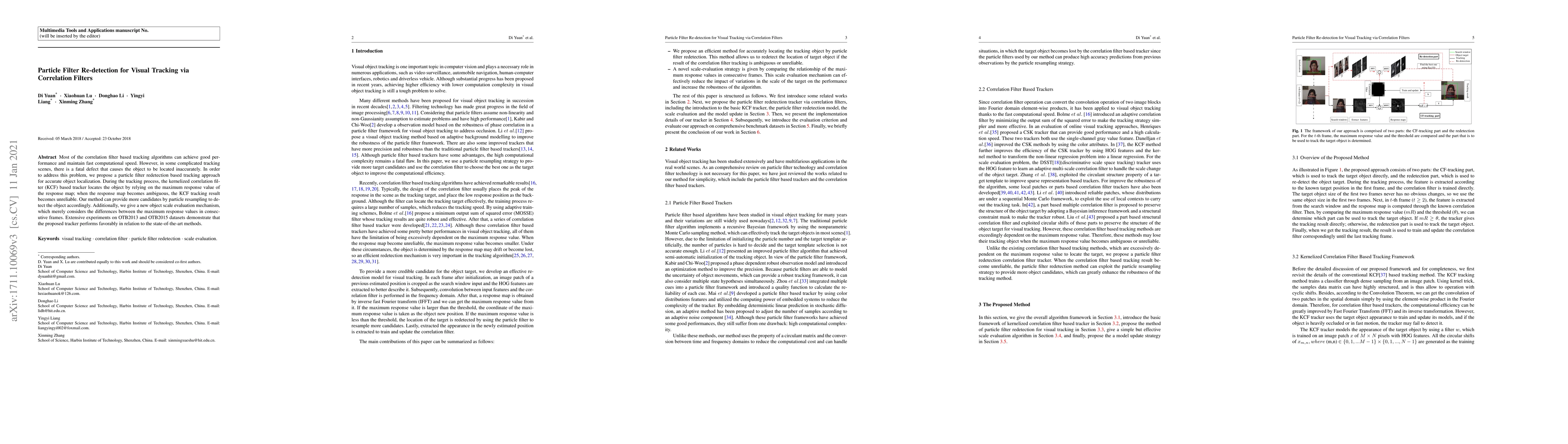 A new tracking approach is proposed to improve accuracy in complex scenes using particle filters for redetection via correlation filters, outperforming state-of-the-art methods on OTB2013 and OTB2015 datasets.