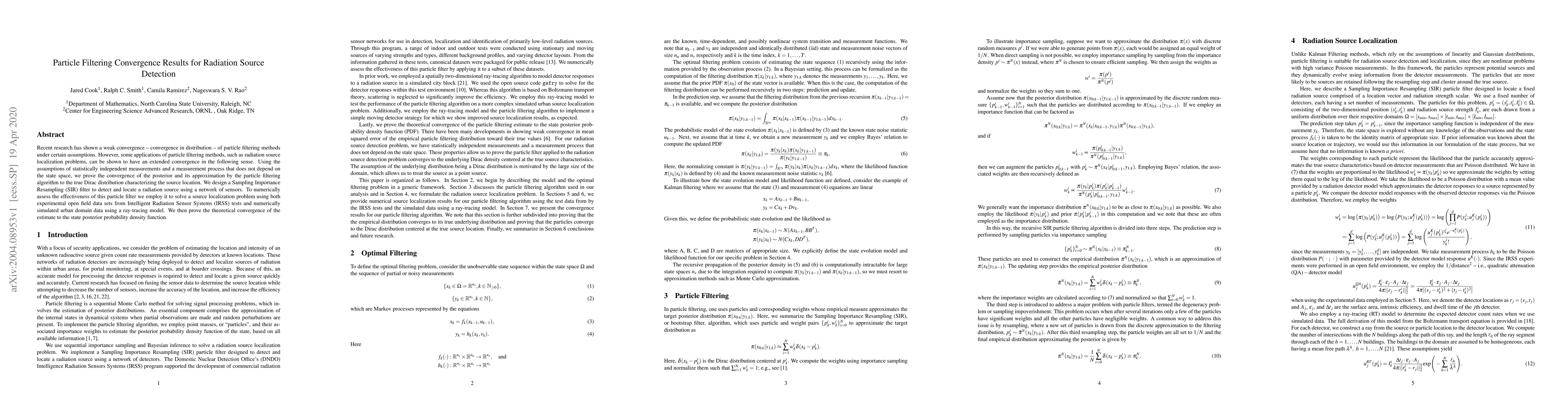 This paper proves the extended convergence of particle filtering methods for radiation source localization, demonstrating that the posterior distribution converges to the true Dirac distribution characterizing the source location. A Sampling Importance Resampling filter is designed and tested on both experimental and simulated data to validate the theoretical convergence results.