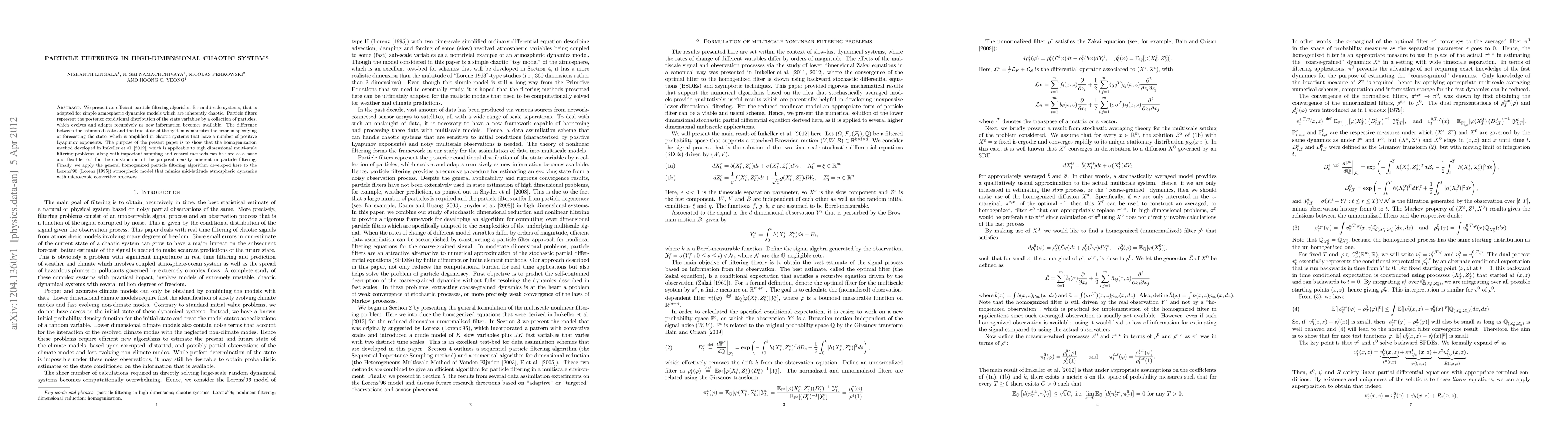 We present an efficient particle filtering algorithm for multiscale systems, that is adapted for simple atmospheric dynamics models which are inherently chaotic. Particle filters represent the posterior conditional distribution of the state variables by a collection of particles, which evolves and adapts recursively as new information becomes available. The difference between the estimated state and the true state of the system constitutes the error in specifying or forecasting the state, which is amplified in chaotic systems that have a number of positive Lyapunov exponents. The purpose of the present paper is to show that the homogenization method developed in Imkeller et al. (2011), which is applicable to high dimensional multi-scale filtering problems, along with important sampling and control methods can be used as a basic and flexible tool for the construction of the proposal density inherent in particle filtering. Finally, we apply the general homogenized particle filtering algorithm developed here to the Lorenz'96 atmospheric model that mimics mid-latitude atmospheric dynamics with microscopic convective processes.