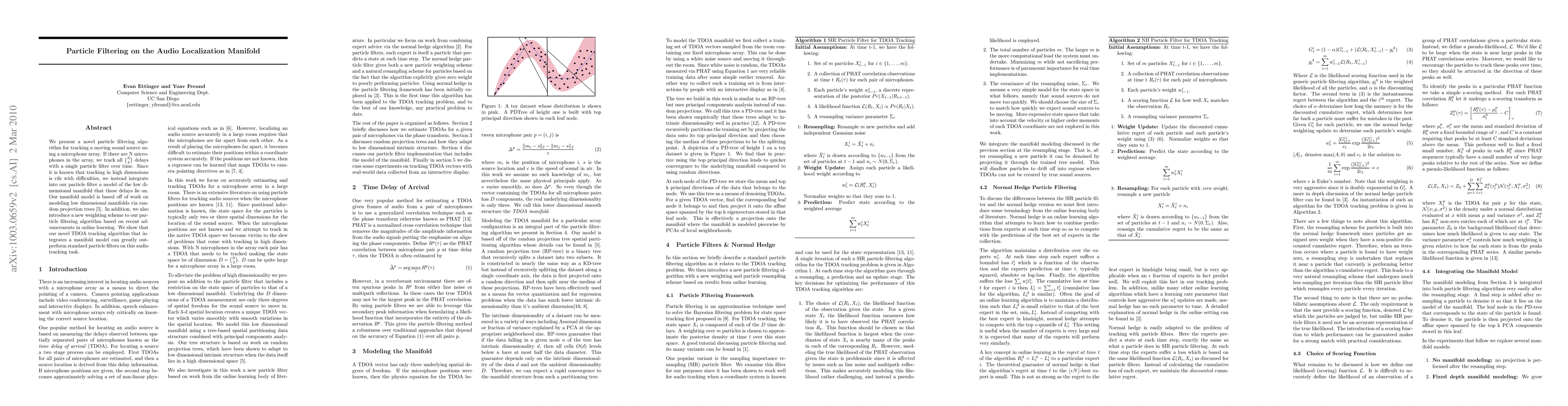 We present a novel particle filtering algorithm for tracking a moving sound source using a microphone array. If there are N microphones in the array, we track all $N \choose 2$ delays with a single particle filter over time. Since it is known that tracking in high dimensions is rife with difficulties, we instead integrate into our particle filter a model of the low dimensional manifold that these delays lie on. Our manifold model is based off of work on modeling low dimensional manifolds via random projection trees [1]. In addition, we also introduce a new weighting scheme to our particle filtering algorithm based on recent advancements in online learning. We show that our novel TDOA tracking algorithm that integrates a manifold model can greatly outperform standard particle filters on this audio tracking task.