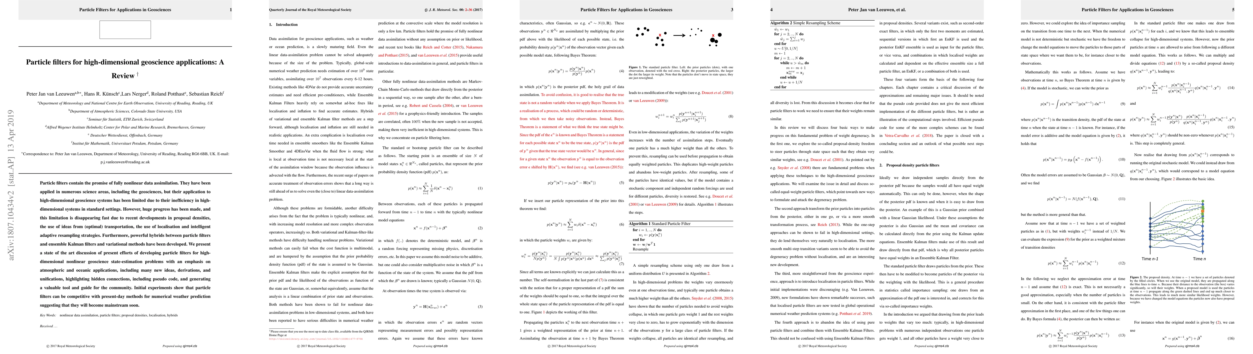 Particle filters contain the promise of fully nonlinear data assimilation. They have been applied in numerous science areas, but their application to the geosciences has been limited due to their inefficiency in high-dimensional systems in standard settings. However, huge progress has been made, and this limitation is disappearing fast due to recent developments in proposal densities, the use of ideas from (optimal) transportation, the use of localisation and intelligent adaptive resampling strategies. Furthermore, powerful hybrids between particle filters and ensemble Kalman filters and variational methods have been developed. We present a state of the art discussion of present efforts of developing particle filters for highly nonlinear geoscience state-estimation problems with an emphasis on atmospheric and oceanic applications, including many new ideas, derivations, and unifications, highlighting hidden connections, and generating a valuable tool and guide for the community. Initial experiments show that particle filters can be competitive with present-day methods for numerical weather prediction suggesting that they will become mainstream soon.
