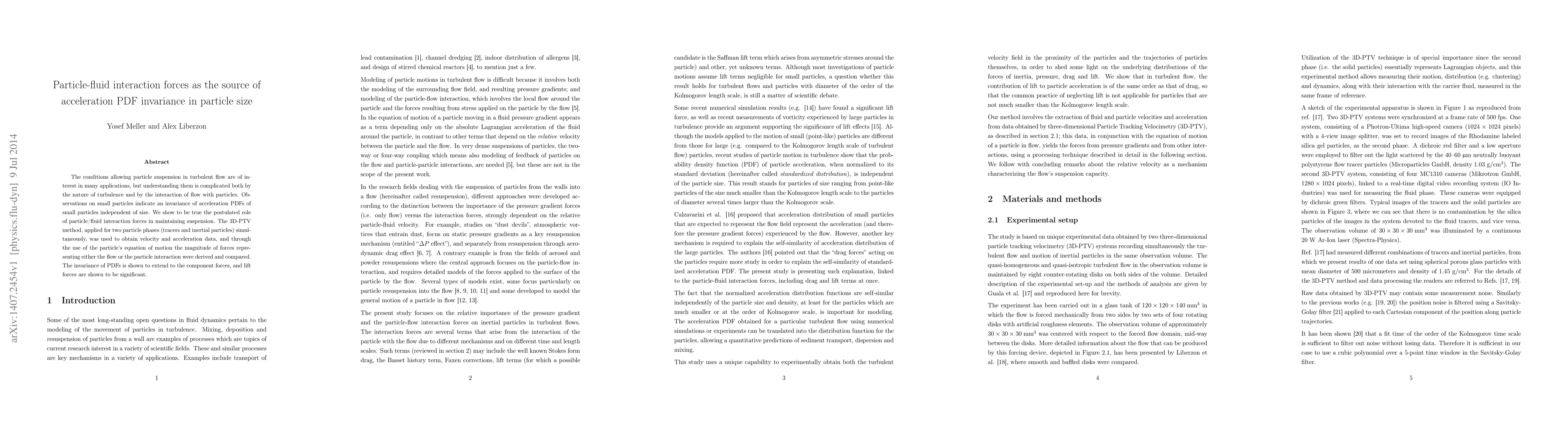 The conditions allowing particle suspension in turbulent flow are of interest in many applications, but understanding them is complicated both by the nature of turbulence and by the interaction of flow with particles. Observations on small particles indicate an invariance of acceleration PDFs of small particles independent of size. We show to be true the postulated role of particle/fluid interaction forces in maintaining suspension. The 3D-PTV method, applied for two particle phases (tracers and inertial particles) simultaneously, was used to obtain velocity and acceleration data, and through the use of the particle's equation of motion the magnitude of forces representing either the flow or the particle interaction were derived and compared. The invariance of PDFs is shown to extend to the component forces, and lift forces are shown to be significant.