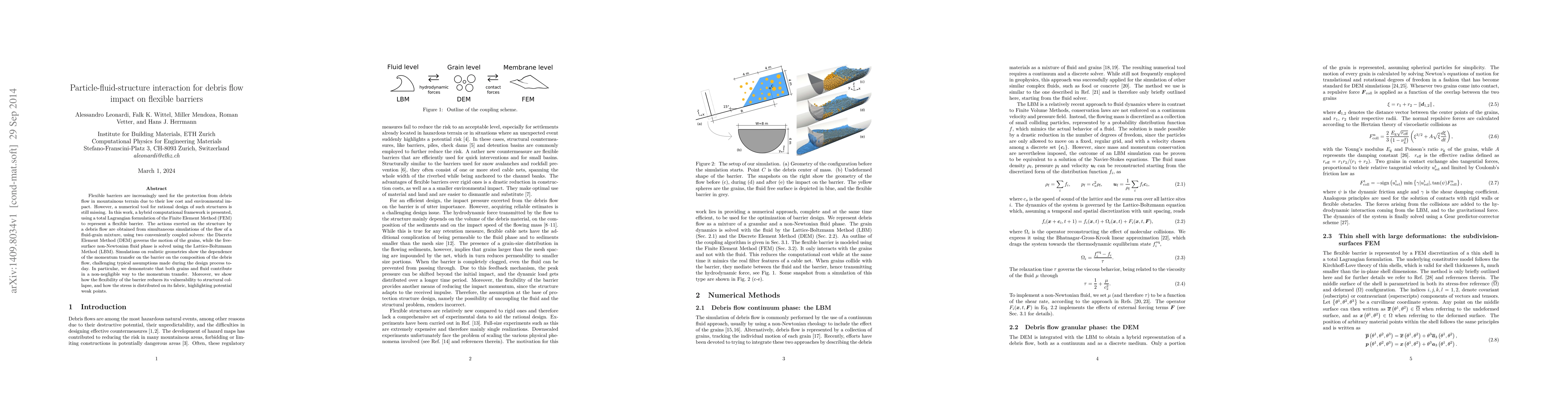 Flexible barriers are increasingly used for the protection from debris flow in mountainous terrain due to their low cost and environmental impact. However, a numerical tool for rational design of such structures is still missing. In this work, a hybrid computational framework is presented, using a total Lagrangian formulation of the Finite Element Method (FEM) to represent a flexible barrier. The actions exerted on the structure by a debris flow are obtained from simultaneous simulations of the flow of a fluid-grain mixture, using two conveniently coupled solvers: the Discrete Element Method (DEM) governs the motion of the grains, while the free-surface non-Newtonian fluid phase is solved using the Lattice-Boltzmann Method (LBM). Simulations on realistic geometries show the dependence of the momentum transfer on the barrier on the composition of the debris flow, challenging typical assumptions made during the design process today. In particular, we demonstrate that both grains and fluid contribute in a non-negligible way to the momentum transfer. Moreover, we show how the flexibility of the barrier reduces its vulnerability to structural collapse, and how the stress is distributed on its fabric, highlighting potential weak points.