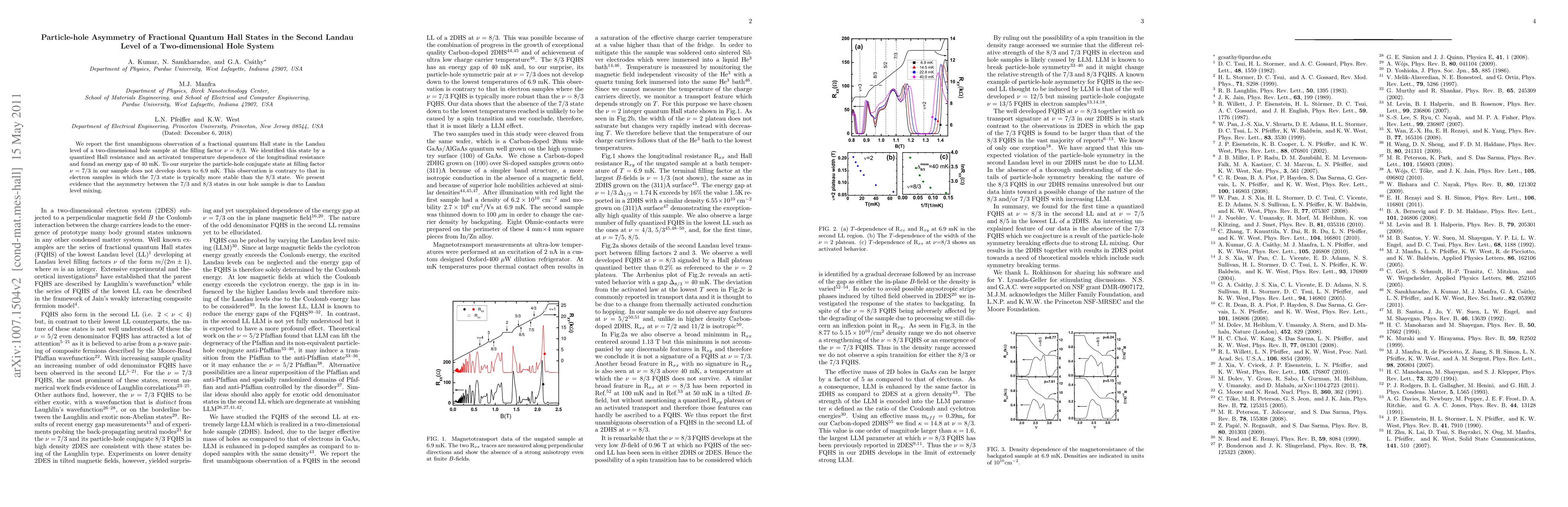 We report the first unambiguous observation of a fractional quantum Hall state in the Landau level of a two-dimensional hole sample at the filling factor $\nu=8/3$. We identified this state by a quantized Hall resistance and an activated temperature dependence of the longitudinal resistance and found an energy gap of 40 mK. To our surprise the particle-hole conjugate state at filling factor $\nu=7/3$ in our sample does not develop down to 6.9 mK. This observation is contrary to that in electron samples in which the 7/3 state is typically more stable than the 8/3 state. We present evidence that the asymmetry between the 7/3 and 8/3 states in our hole sample is due to Landau level mixing.