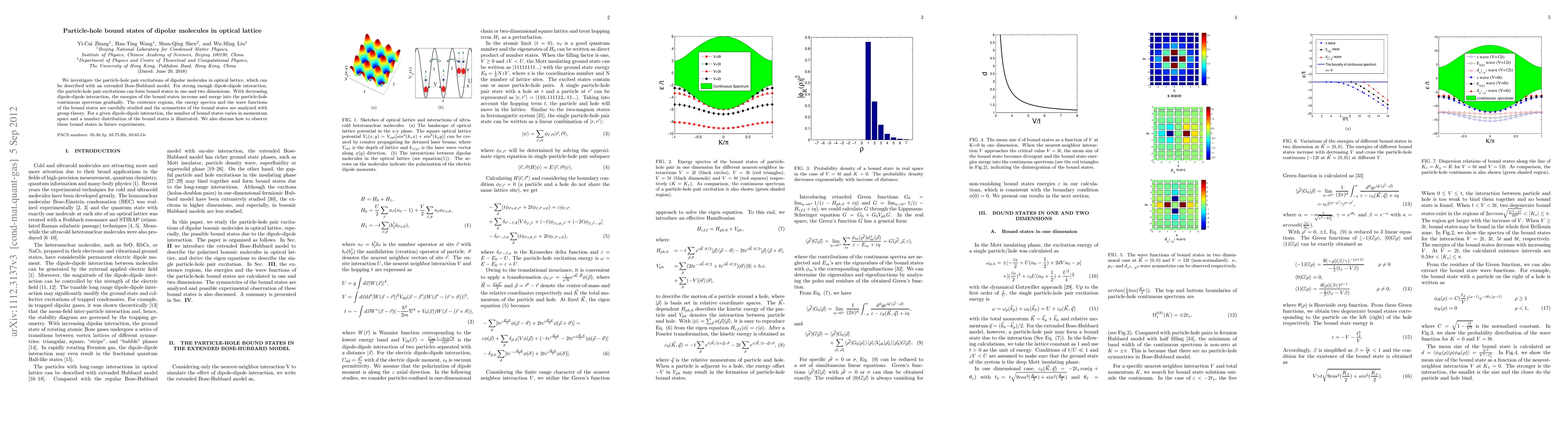 This paper explores the formation of particle-hole bound states in dipolar molecules within optical lattices, described by an extended Bose-Hubbard model. The study reveals that strong dipole-dipole interactions lead to bound states in 1D and 2D, which transition to a continuous spectrum as interactions weaken.