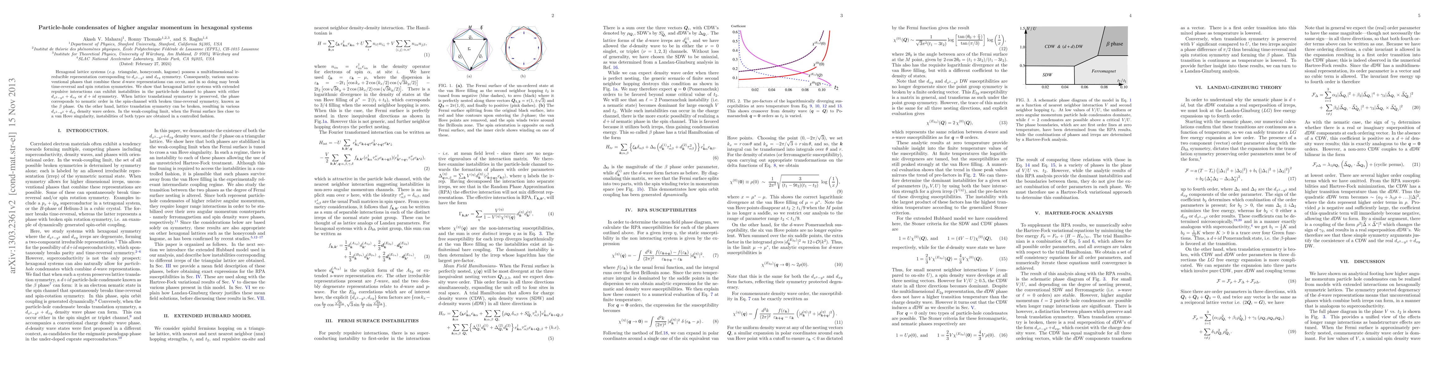 Hexagonal lattice systems (e.g. triangular, honeycomb, kagome) possess a multidimensional irreducible representation corresponding to $d_{x^2-y^2}$ and $d_{xy}$ symmetry. Consequently, various unconventional phases that combine these $d$-wave representations can occur, and in so doing may break time-reversal and spin rotation symmetries. We show that hexagonal lattice systems with extended repulsive interactions can exhibit instabilities in the particle-hole channel to phases with either $d_{x^2-y^2}+d_{xy}$ or $d+id$ symmetry. When lattice translational symmetry is preserved, the phase corresponds to nematic order in the spin-channel with broken time-reversal symmetry, known as the $\beta$ phase. On the other hand, lattice translation symmetry can be broken, resulting in various $d_{x^2-y^2}+d_{xy}$ density wave orders. In the weak-coupling limit, when the Fermi surface lies close to a van Hove singularity, instabilities of both types are obtained in a controlled fashion.