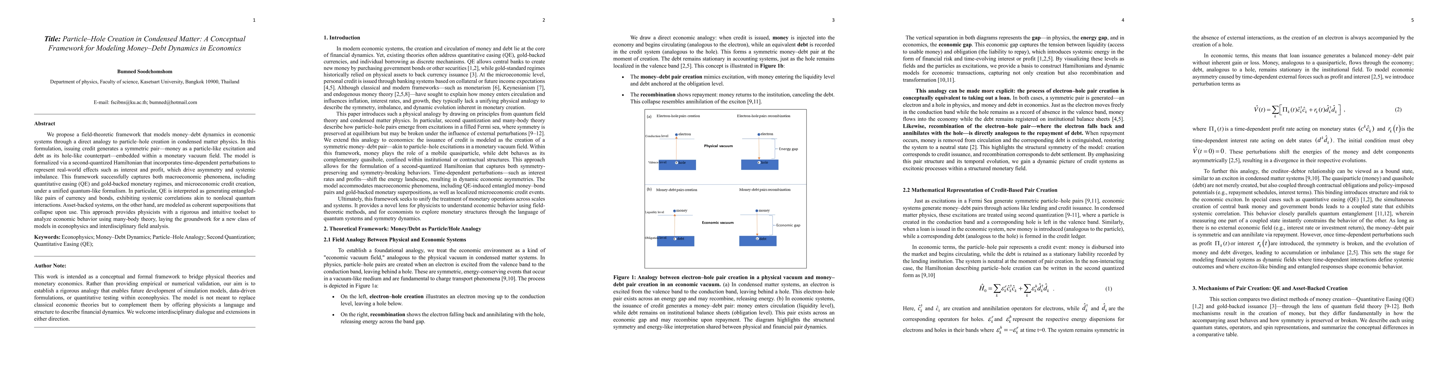 We propose a field-theoretic framework that models money-debt dynamics in economic systems through a direct analogy to particle-hole creation in condensed matter physics. In this formulation, issuing credit generates a symmetric pair-money as a particle-like excitation and debt as its hole-like counterpart-embedded within a monetary vacuum field. The model is formalized via a second-quantized Hamiltonian that incorporates time-dependent perturbations to represent real-world effects such as interest and profit, which drive asymmetry and systemic imbalance. This framework successfully captures both macroeconomic phenomena, including quantitative easing (QE) and gold-backed monetary regimes, and microeconomic credit creation, under a unified quantum-like formalism. In particular, QE is interpreted as generating entangled-like pairs of currency and bonds, exhibiting systemic correlations akin to nonlocal quantum interactions. Asset-backed systems, on the other hand, are modeled as coherent superpositions that collapse upon use. This approach provides physicists with a rigorous and intuitive toolset to analyze economic behavior using many-body theory, laying the groundwork for a new class of models in econophysics and interdisciplinary field analysis.