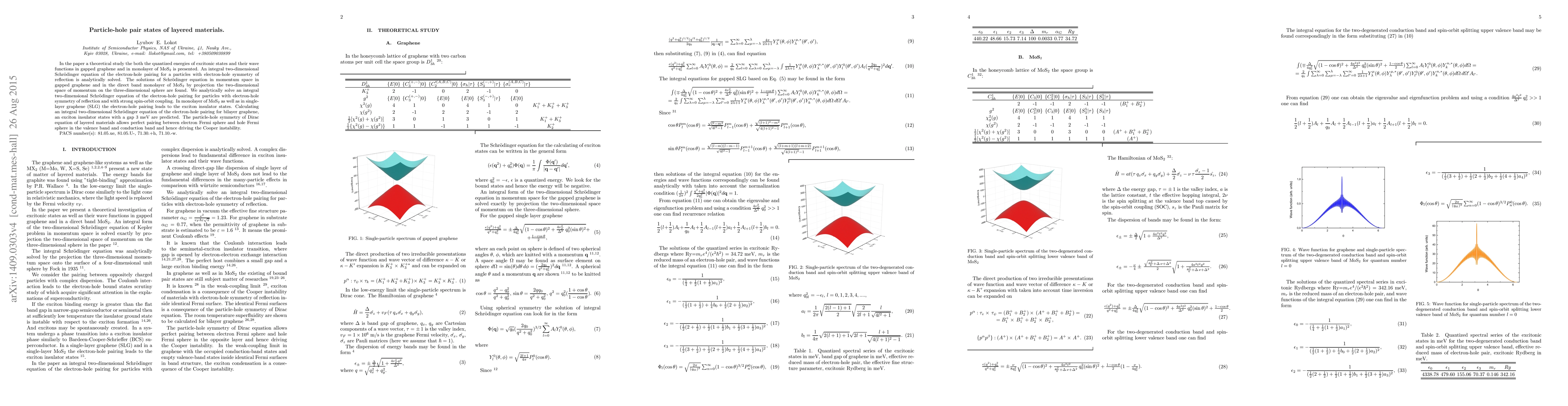 In the paper a theoretical study the both the quantized energies of excitonic states and their wave functions in gapped graphene and in monolayer of MoS2 is presented. An integral two-dimensional Schr\"odinger equation of the electron-hole pairing for a particles with electron-hole symmetry of reflection is analytically solved. The solutions of Schr\"odinger equation in momentum space in gapped graphene and in the direct band monolayer of MoS2 by projection the two-dimensional space of momentum on the three-dimensional sphere are found. We analytically solve an integral two-dimensional Schr\"odinger equation of the electron-hole pairing for particles with electron-hole symmetry of reflection and with strong spin-orbit coupling. In monolayer of MoS2 as well as in single-layer graphene (SLG) the electron-hole pairing leads to the exciton insulator states. Calculating an integral two-dimensional Schr\"odinger equation of the electron-hole pairing for bilayer graphene, an exciton insulator states with a gap 3 meV are predicted. The particle-hole symmetry of Dirac equation of layered materials allows perfect pairing between electron Fermi sphere and hole Fermi sphere in the valence band and conduction band and hence driving the Cooper instability.