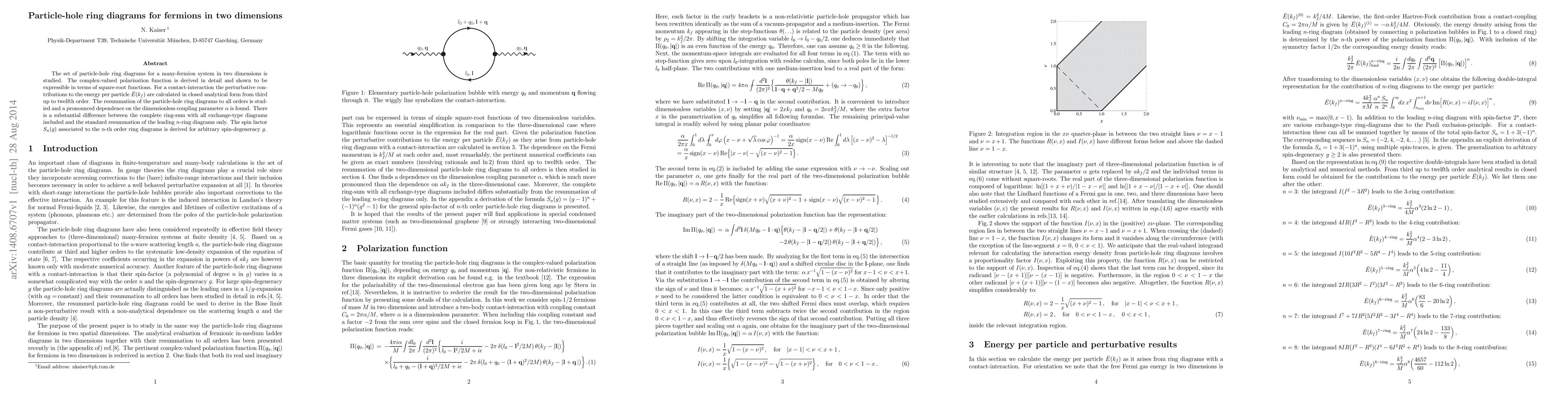 The set of particle-hole ring diagrams for a many-fermion system in two dimensions is studied. The complex-valued polarization function is derived in detail and shown to be expressible in terms of square-root functions. For a contact-interaction the perturbative contributions to the energy per particle $\bar E(k_f)$ are calculated in closed analytical form from third up to twelfth order. The resummation of the particle-hole ring diagrams to all orders is studied and a pronounced dependence on the dimensionless coupling parameter $\alpha$ is found. There is a substantial difference between the complete ring-sum with all exchange-type diagrams included and the standard resummation of the leading $n$-ring diagrams only. The spin factor $S_n(g)$ associated to the $n$-th order ring diagrams is derived for arbitrary spin-degeneracy $g$.