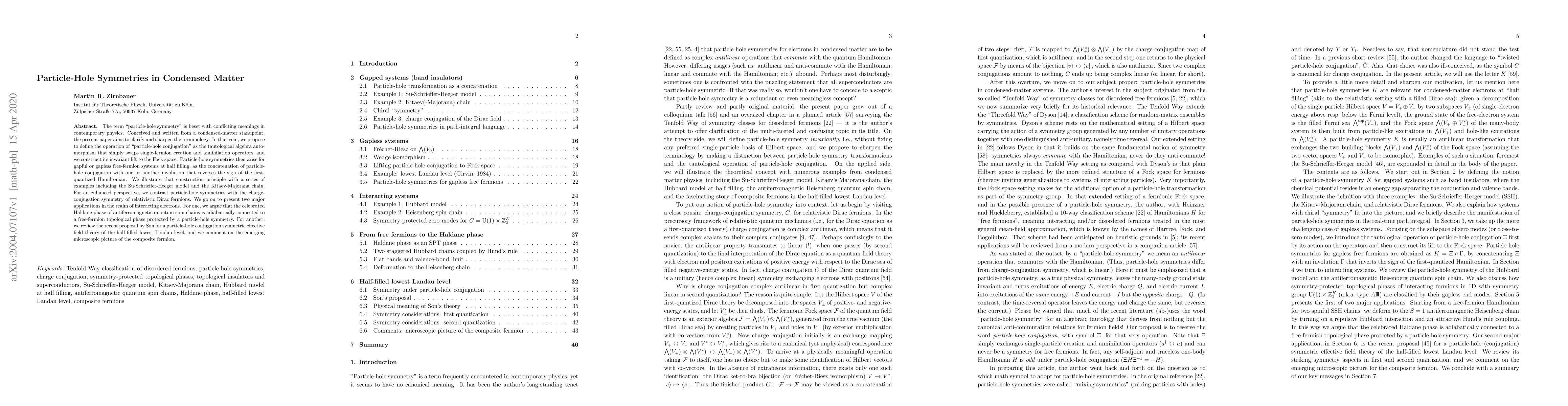 This paper clarifies the concept of particle-hole symmetry in condensed matter physics, defining particle-hole conjugation as an algebra automorphism that swaps fermion operators. It illustrates this with examples like the Su-Schrieffer-Heeger model and the Kitaev-Majorana chain, and discusses its applications in topological phases and composite fermions.