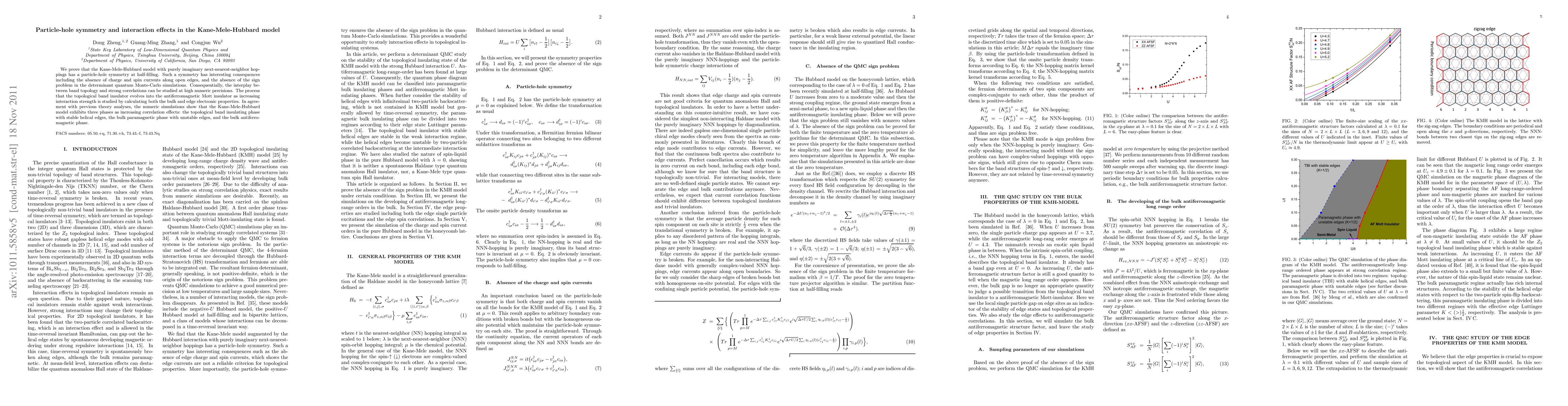 We prove that the Kane-Mele-Hubbard model with purely imaginary next-nearest-neighbor hoppings has a particle-hole symmetry at half-filling. Such a symmetry has interesting consequences including the absence of charge and spin currents along open edges, and the absence of the sign problem in the determinant quantum Monte-Carlo simulations. Consequentially, the interplay between band topology and strong correlations can be studied at high numeric precisions. The process that the topological band insulator evolves into the antiferromagnetic Mott insulator as increasing interaction strength is studied by calculating both the bulk and edge electronic properties. In agreement with previous theory analyses, the numeric simulations show that the Kane-Mele-Hubbard model exhibits three phases as increasing correlation effects: the topological band insulating phase with stable helical edges, the bulk paramagnetic phase with unstable edges, and the bulk antiferromagnetic phase.