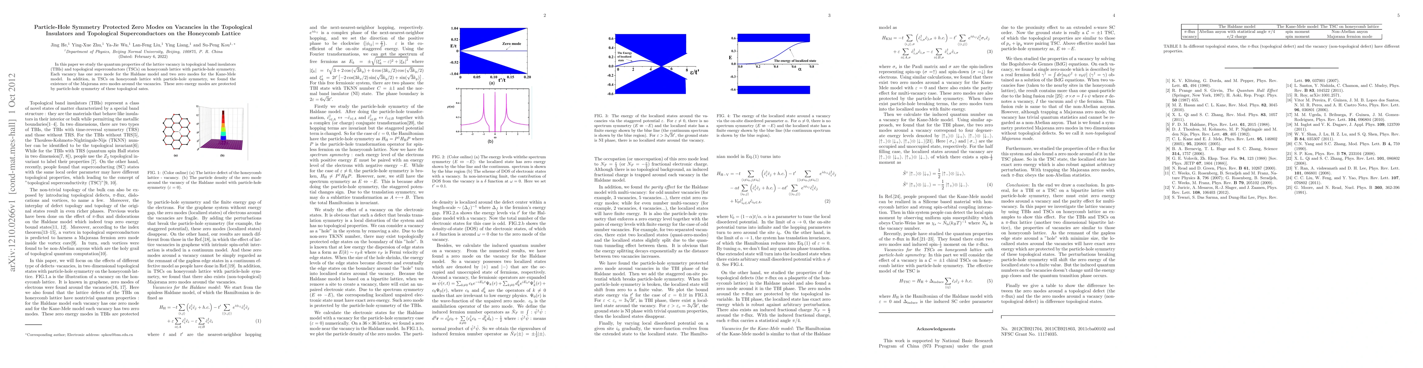 This paper investigates the quantum properties of lattice vacancies in topological band insulators and superconductors on the honeycomb lattice, revealing zero modes protected by particle-hole symmetry. It finds one zero mode for the Haldane model and two for the Kane-Mele model, along with Majorana zero modes in topological superconductors.