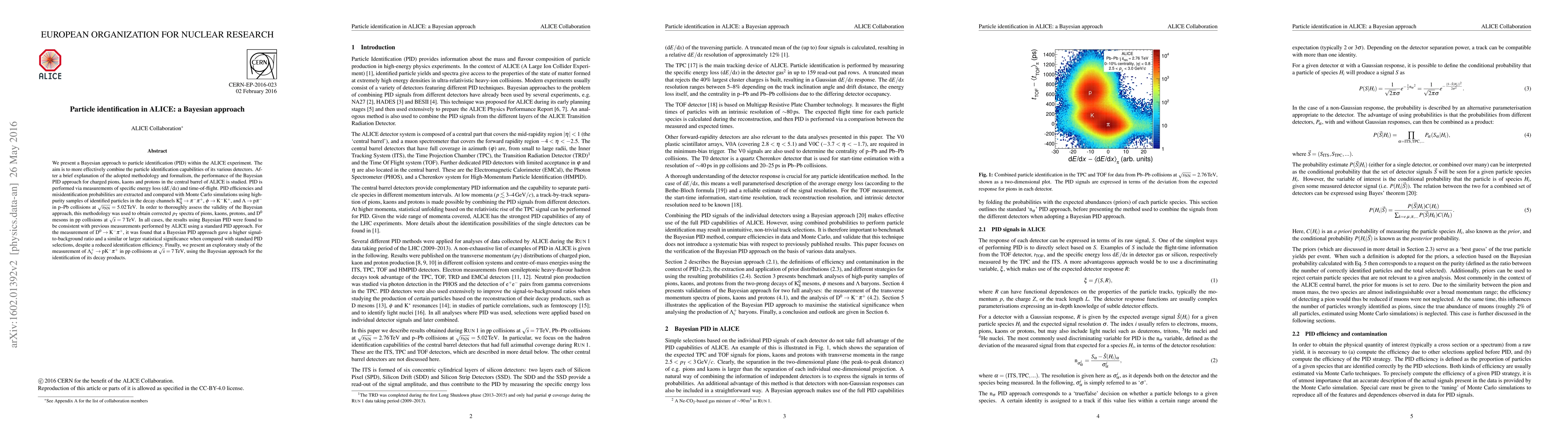 This paper introduces a Bayesian approach for particle identification (PID) in the ALICE experiment, combining various detector capabilities to enhance PID efficiency. The Bayesian method is tested on charged pions, kaons, and protons, showing consistent results with previous ALICE methods and improved signal-to-background ratios for D$^0$ mesons.