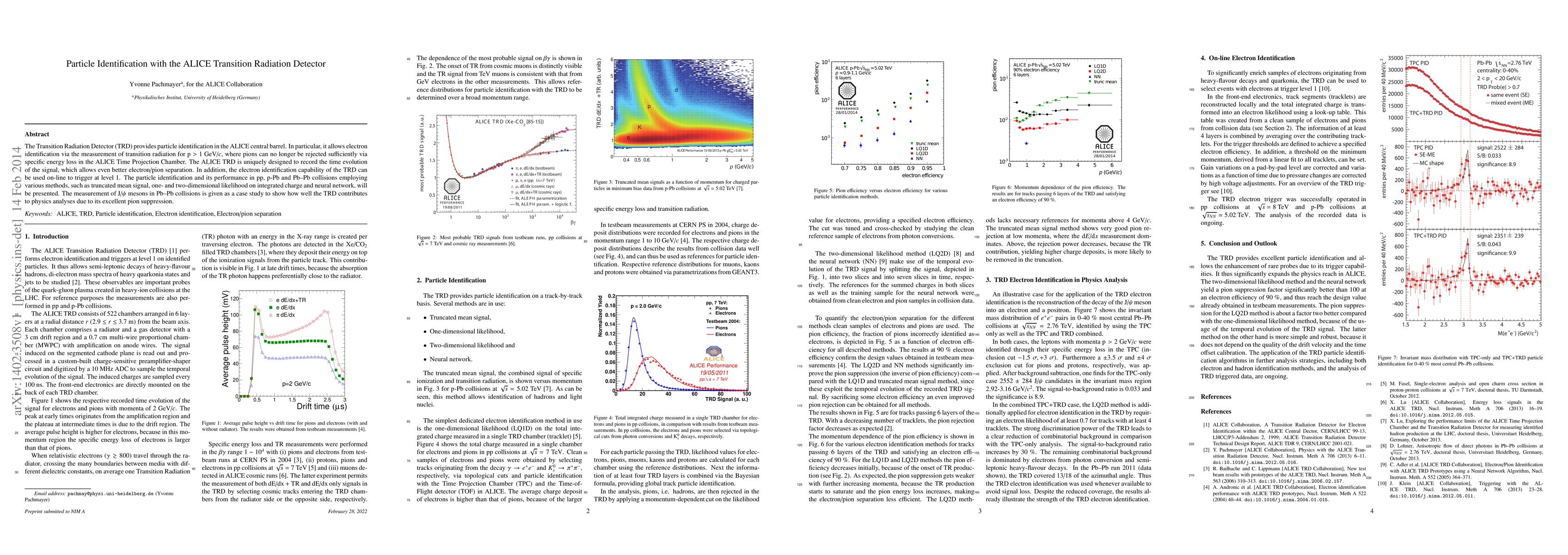 The Transition Radiation Detector (TRD) provides particle identification in the ALICE central barrel. In particular, it allows electron identification via the measurement of transition radiation for $\rm p >$ 1 GeV/$c$, where pions can no longer be rejected sufficiently via specific energy loss in the ALICE Time Projection Chamber. The ALICE TRD is uniquely designed to record the time evolution of the signal, which allows even better electron/pion separation. In addition, the electron identification capability of the TRD can be used on-line to trigger at level 1. The particle identification and its performance in pp, p-Pb and Pb-Pb collisions employing various methods, such as truncated mean signal, one- and two-dimensional likelihood on integrated charge and neural network, will be presented. The measurement of J/$\psi$ mesons in Pb-Pb collisions is given as a case study to show how well the TRD contributes to physics analyses due to its excellent pion suppression.