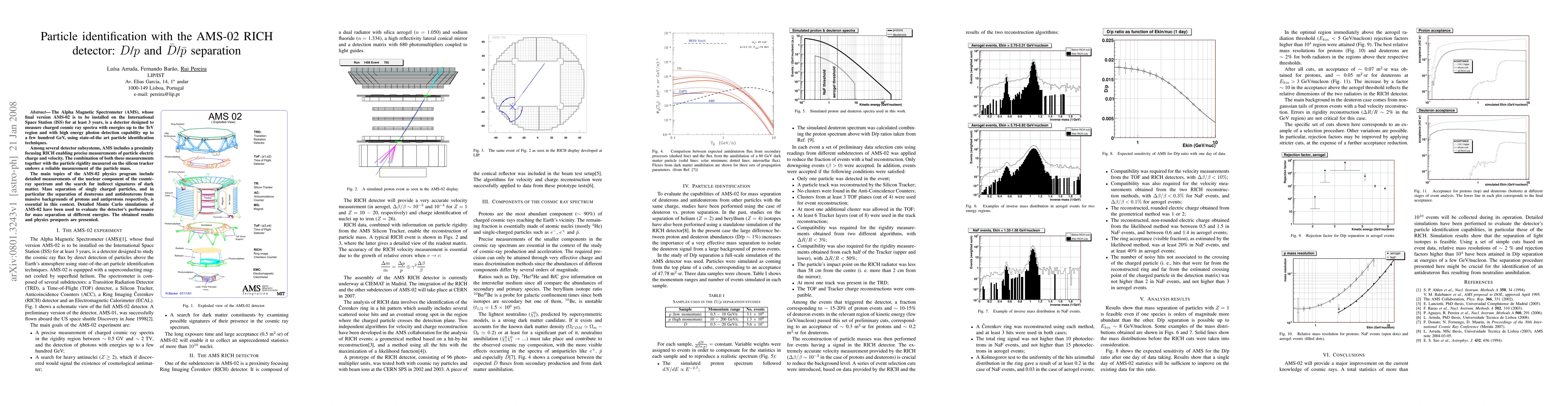 The AMS-02 detector on the ISS uses a RICH system to precisely identify particles by measuring their charge and velocity, enabling the separation of deuterons from protons and antideuterons from antiprotons, crucial for cosmic ray spectrum analysis and dark matter searches. Monte Carlo simulations demonstrate the detector's effectiveness in mass separation across various energies.
