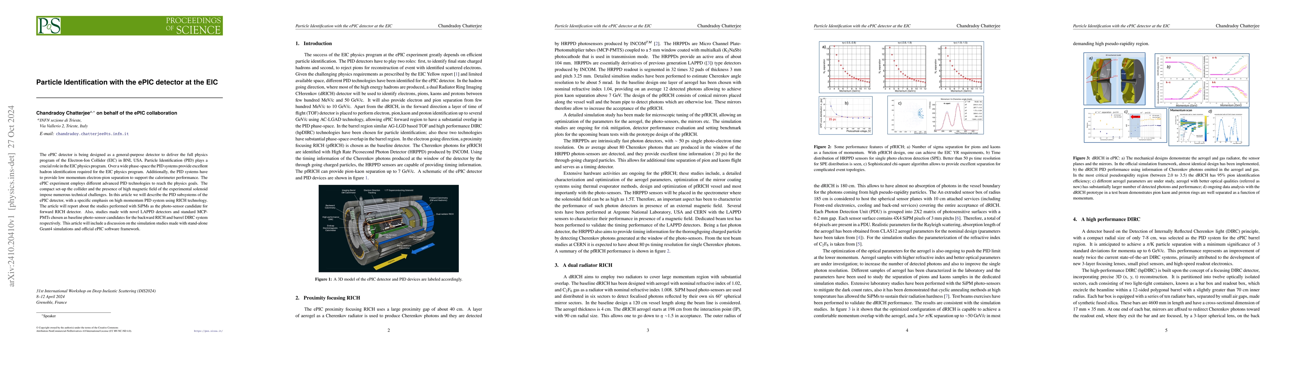 The ePIC detector aims to support the Electron-Ion Collider's physics program through advanced Particle Identification (PID) systems, particularly focusing on high-momentum electron-pion separation using RICH technology, SiPMs, LAPPD detectors, and MCP-PMTs, alongside Geant4 simulation studies.