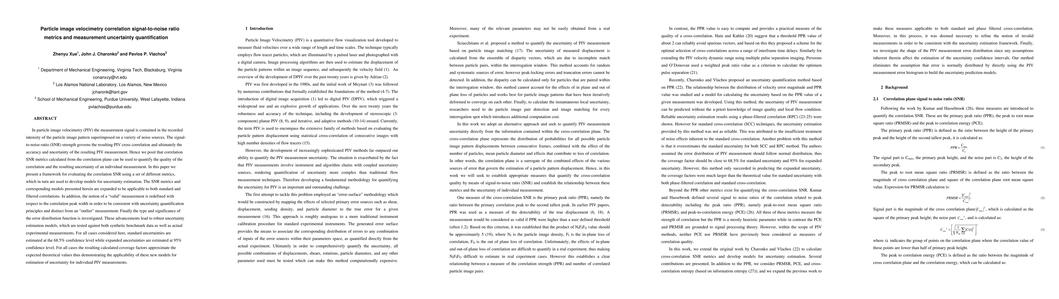 This paper develops a framework for evaluating the signal-to-noise ratio (SNR) in particle image velocimetry (PIV) using correlation SNR metrics to quantify measurement quality and uncertainty. The proposed metrics and models are tested against both synthetic and experimental data, demonstrating robust uncertainty estimation at various confidence levels.