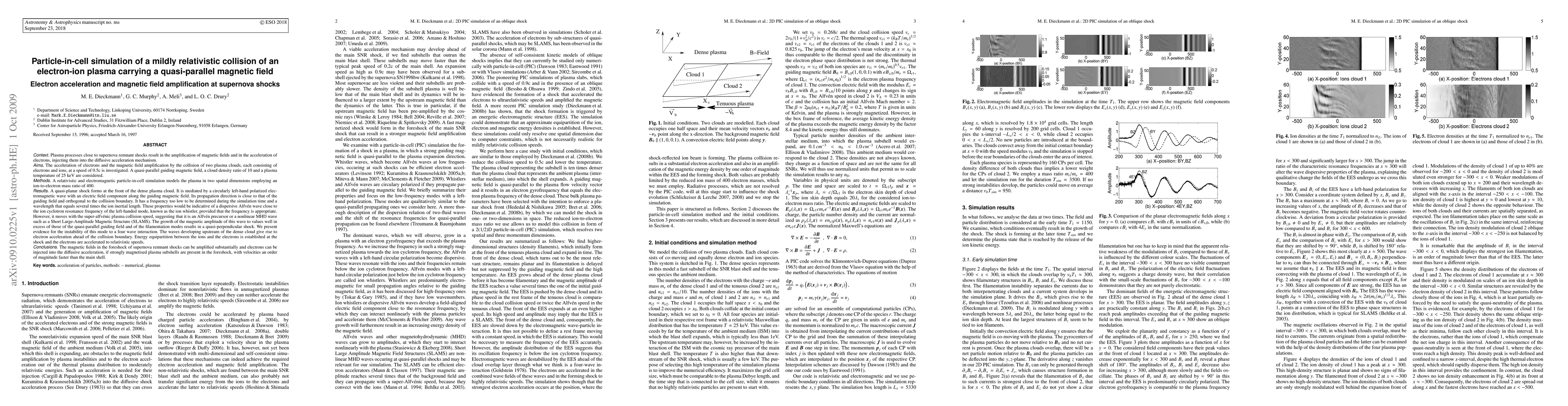 This paper investigates the particle-in-cell simulation of a mildly relativistic collision of electron-ion plasmas at supernova shock fronts, focusing on electron acceleration and magnetic field amplification. The study reveals the formation of a quasi-perpendicular shock driven by a dispersive Alfven wave, leading to electron acceleration to relativistic speeds and significant magnetic field amplification.