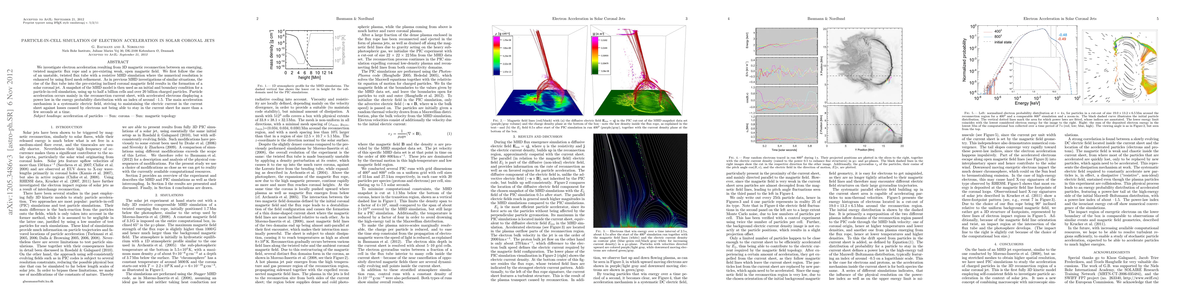 A study uses computer simulations to model electron acceleration in solar coronal jets, finding that a systematic electric field drives the acceleration of electrons during magnetic reconnection.