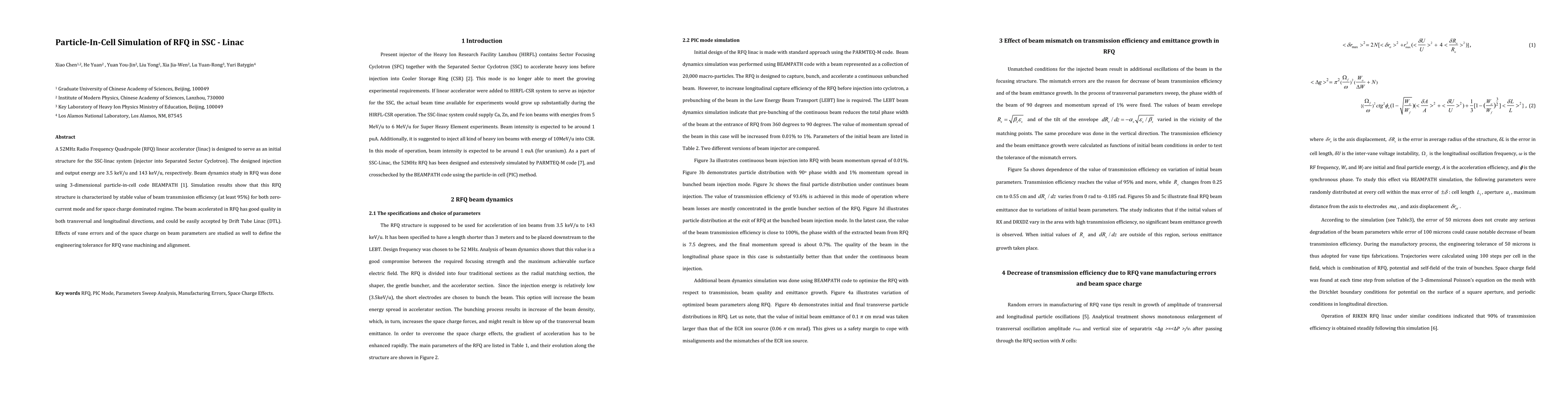 This paper presents a particle-in-cell simulation of a 52MHz RFQ linac designed for the SSC-linac system, showing stable beam transmission efficiency of at least 95% and good beam quality, while also analyzing the effects of vane errors and space charge.