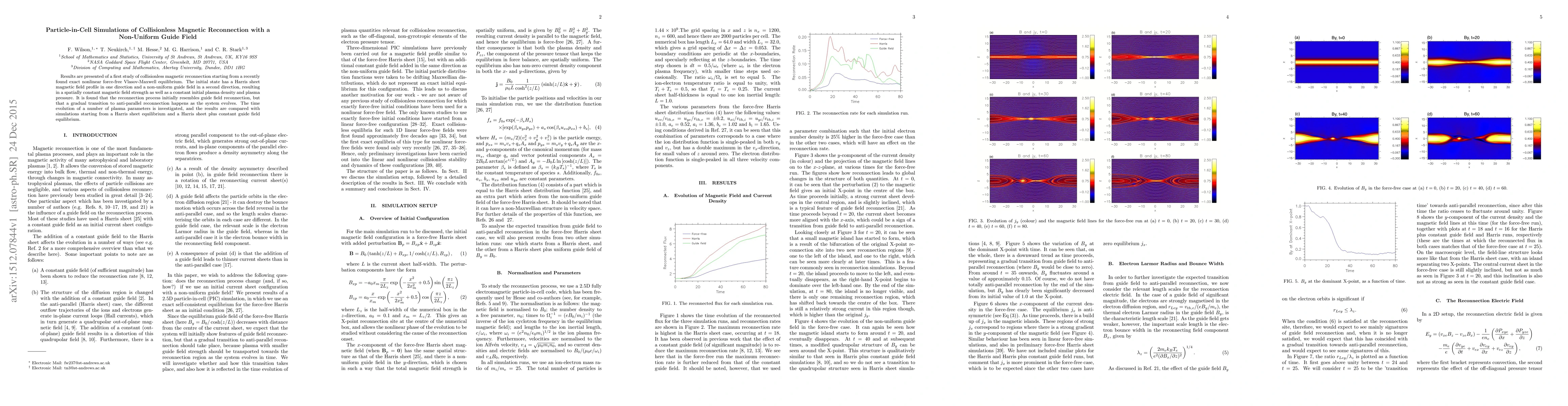 This paper investigates collisionless magnetic reconnection using particle-in-cell simulations, starting from a nonlinear force-free Vlasov-Maxwell equilibrium with a non-uniform guide field. The study finds that initial guide field reconnection transitions to anti-parallel reconnection over time, with results compared to Harris sheet equilibria.