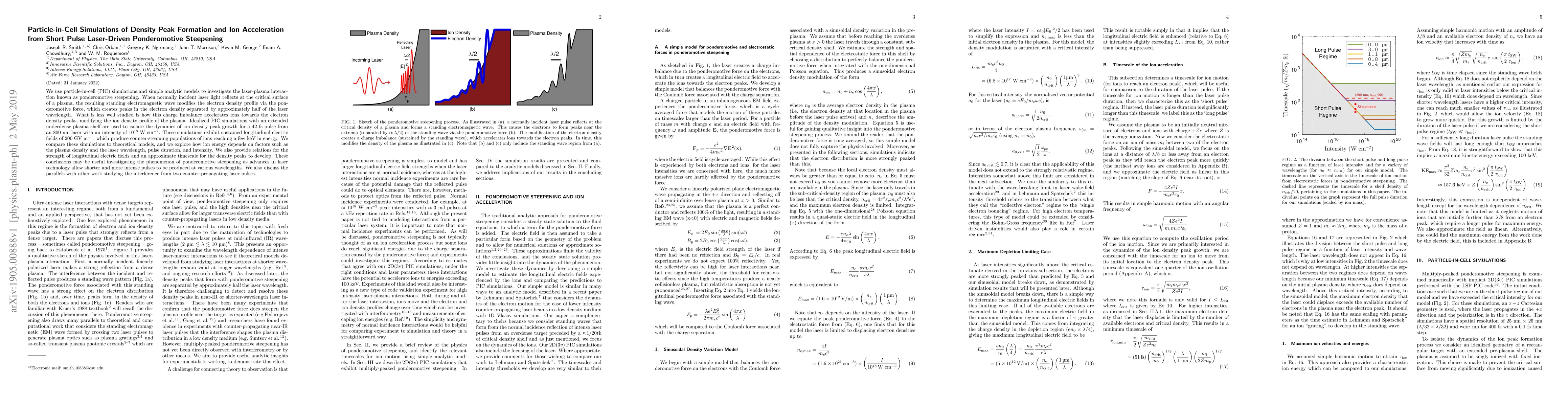 We use particle-in-cell (PIC) simulations and simple analytic models to investigate the laser-plasma interaction known as ponderomotive steepening. When normally incident laser light reflects at the critical surface of a plasma, the resulting standing electromagnetic wave modifies the electron density profile via the ponderomotive force, which creates peaks in the electron density separated by approximately half of the laser wavelength. What is less well studied is how this charge imbalance accelerates ions towards the electron density peaks, modifying the ion density profile of the plasma. Idealized PIC simulations with an extended underdense plasma shelf are used to isolate the dynamics of ion density peak growth for a 42 fs pulse from an 800 nm laser with an intensity of 10$^{18}$ W cm$^{-2}$. These simulations exhibit sustained longitudinal electric fields of 200 GV m$^{-1}$, which produce counter-steaming populations of ions reaching a few keV in energy. We compare these simulations to theoretical models, and we explore how ion energy depends on factors such as the plasma density and the laser wavelength, pulse duration, and intensity. We also provide relations for the strength of longitudinal electric fields and an approximate timescale for the density peaks to develop. These conclusions may be useful investigating the phenomenon of ponderomotive steepening as advances in laser technology allow shorter and more intense pulses to be produced at various wavelengths. We also discuss the parallels with other work studying the interference from two counter-propagating laser pulses.