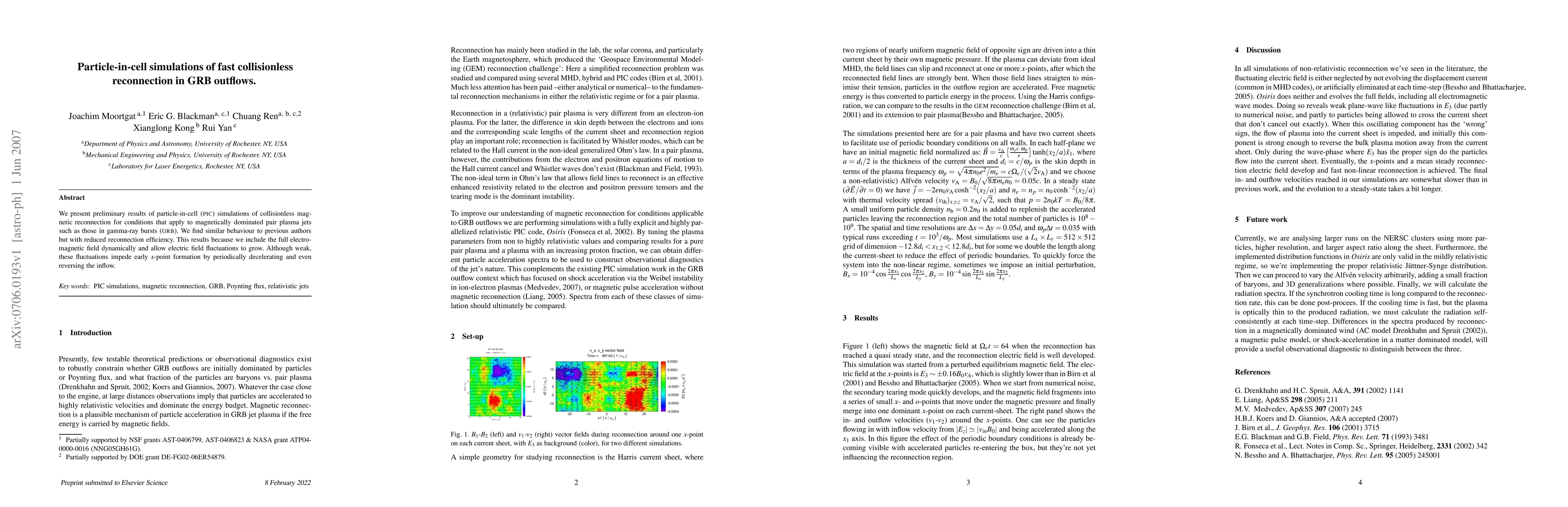 We present preliminary results of particle-in-cell simulations of collisionless magnetic reconnection for conditions that apply to magnetically dominated pair plasma jets such as those in gamma-ray bursts. We find similar behaviour to previous authors but with reduced reconnection efficiency. This results because we include the full electromagnetic field dynamically and allow electric field fluctuations to grow. Although weak, these fluctuations impede early x-point formation by periodically decelerating and even reversing the inflow.