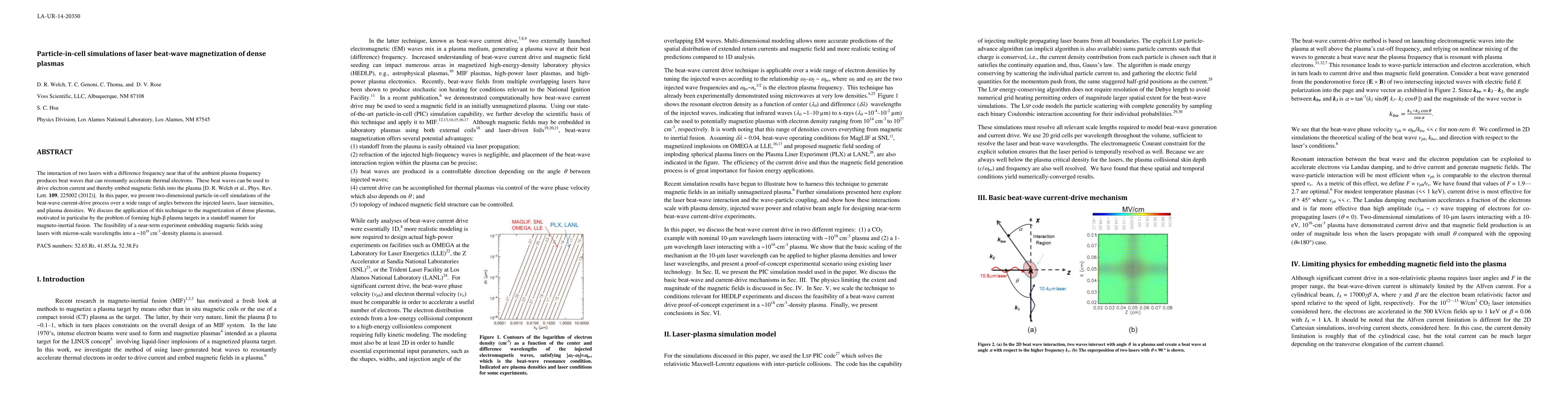 The interaction of two lasers with a difference frequency near that of the ambient plasma frequency produces beat waves that can resonantly accelerate thermal electrons. These beat waves can be used to drive electron current and thereby embed magnetic fields into the plasma [D. R. Welch et al., Phys. Rev. Lett. 109, 225002 (2012)]. In this paper, we present two-dimensional particle-in-cell simulations of the beat-wave current-drive process over a wide range of angles between the injected lasers, laser intensities, and plasma densities. We discuss the application of this technique to the magnetization of dense plasmas, motivated in particular by the problem of forming high-beta plasma targets in a standoff manner for magneto-inertial fusion. The feasibility of a near-term experiment embedding magnetic fields using lasers with micron-scale wavelengths into a $\sim 10^{18}$-cm$^{-3}$-density plasma is assessed.