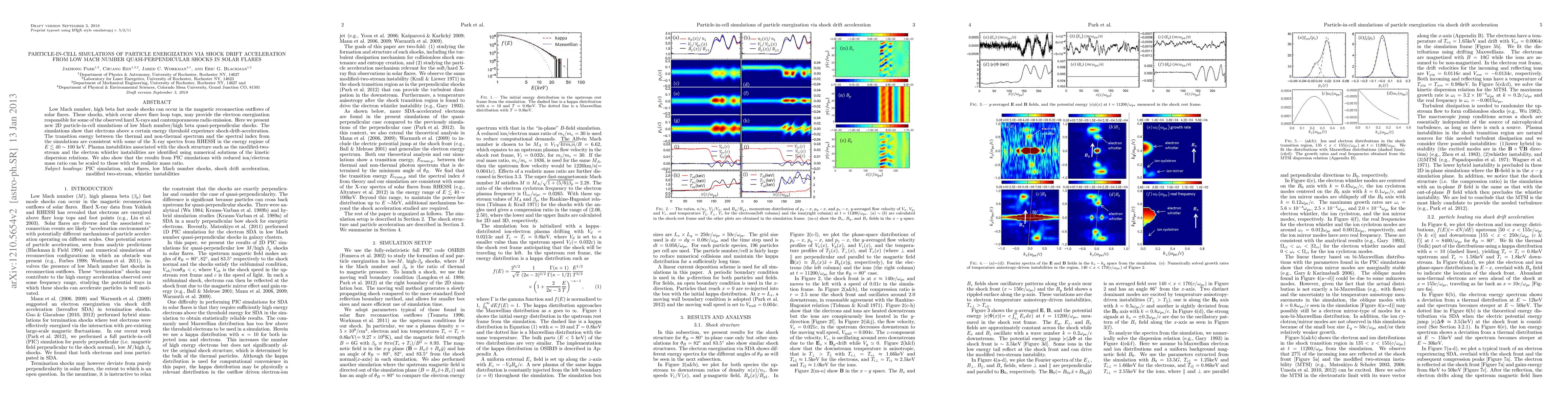 This paper presents particle-in-cell simulations of electron energization via shock-drift acceleration in low Mach number quasi-perpendicular shocks in solar flares, showing consistency with RHESSI X-ray spectra and identifying plasma instabilities. Results from simulations with reduced mass ratios scale to those with realistic mass ratios.