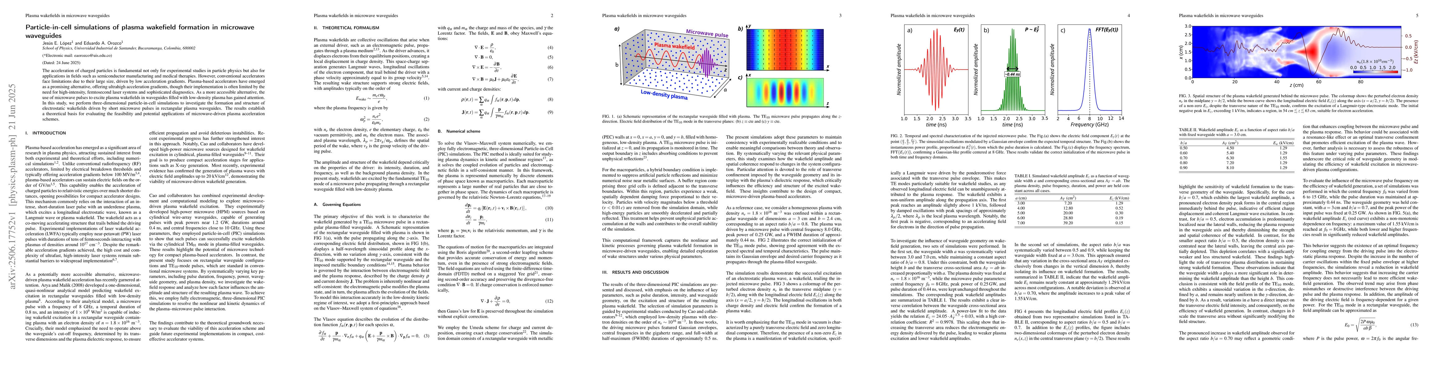 The acceleration of charged particles is fundamental not only for experimental studies in particle physics but also for applications in fields such as semiconductor manufacturing and medical therapies. However, conventional accelerators face limitations due to their large size, driven by low acceleration gradients. Plasma-based accelerators have emerged as a promising alternative, offering ultrahigh acceleration gradients, though their implementation is often limited by the need for high-intensity, femtosecond laser systems and sophisticated diagnostics. As a more accessible alternative, the use of microwave pulses to excite plasma wakefields in waveguides filled with low-density plasma has gained attention. In this study, we perform three-dimensional particle-in-cell simulations to investigate the formation and structure of electrostatic wakefields driven by short microwave pulses in rectangular plasma waveguides. The results establish a theoretical basis for evaluating the feasibility and potential applications of microwave-driven plasma acceleration schemes.