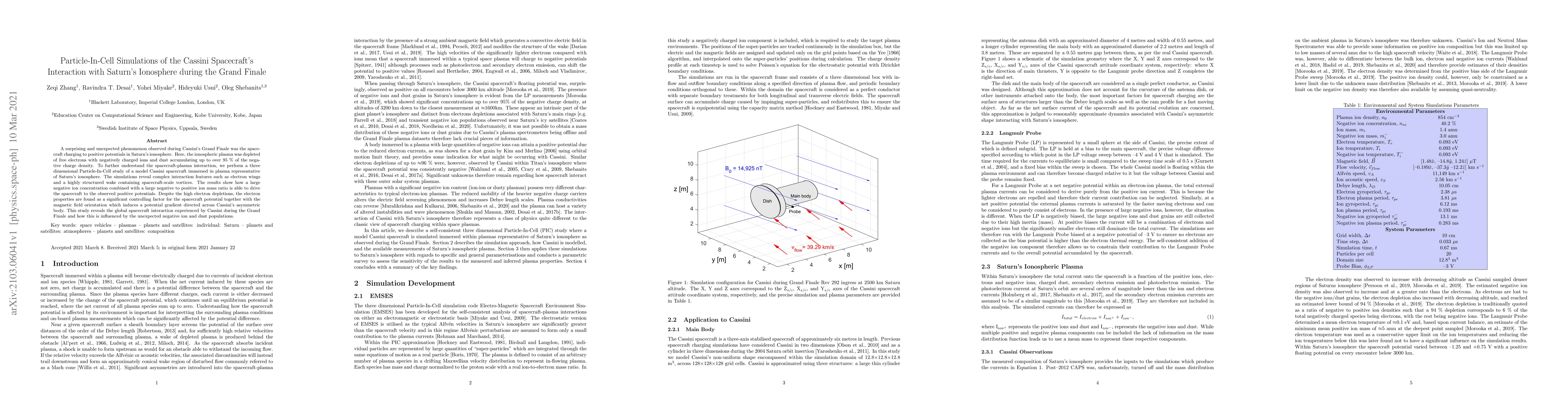 This paper uses Particle-In-Cell simulations to explore Cassini's interaction with Saturn's ionosphere during its Grand Finale, revealing a spacecraft charging to positive potentials due to high negative ion concentrations and a structured wake with vortices. The study highlights the influence of electron depletions and magnetic field orientation on the spacecraft potential.