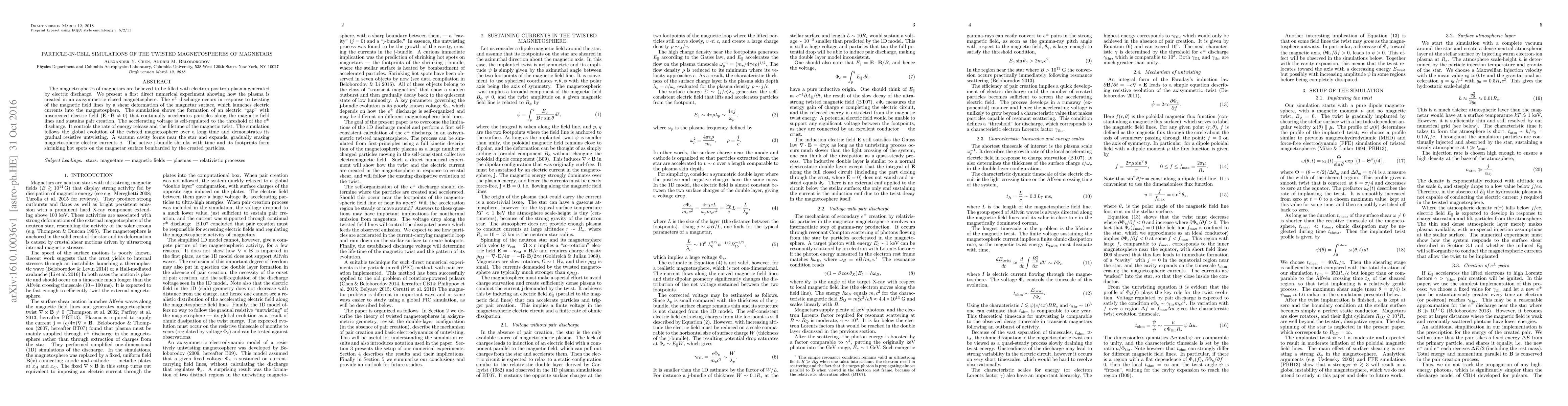 This study uses particle-in-cell simulations to demonstrate the formation of electron-positron plasma in magnetar magnetospheres due to twisting magnetic field lines, creating an electric "gap" that sustains pair creation and accelerates particles. The simulation shows the gradual resistive untwisting and formation of a vacuum cavity near the star.