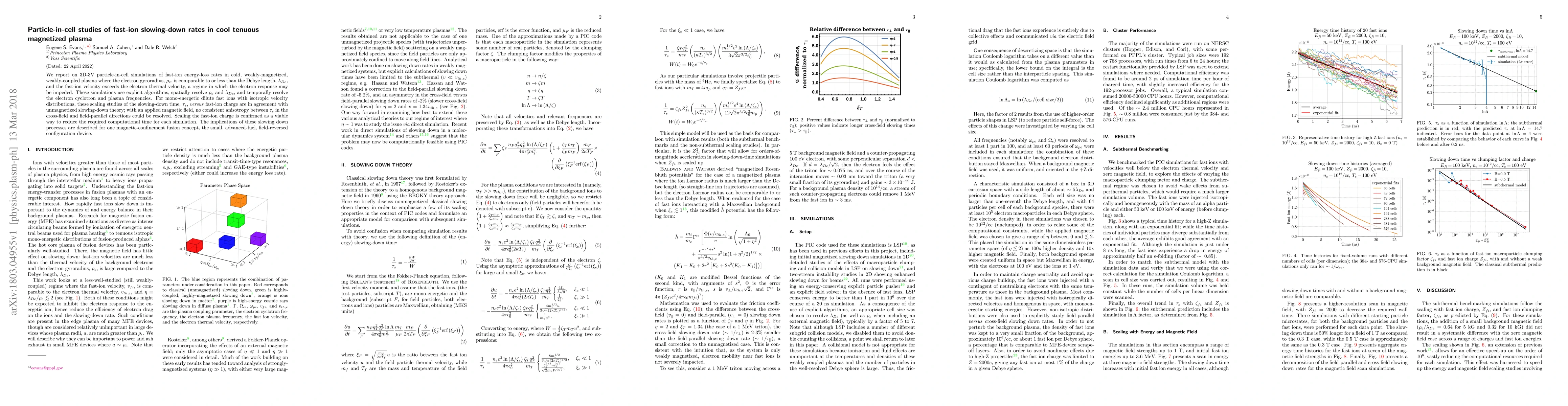 We report on 3D-3V particle-in-cell simulations of fast-ion energy-loss rates in cold, weakly-magnetized, weakly-coupled plasma where the electron gyroradius, $\rho_{e}$, is comparable to or less than the Debye length, $\lambda_{De}$, and the fast-ion velocity exceeds the electron thermal velocity, a regime in which the electron response may be impeded. These simulations use explicit algorithms, spatially resolve $\rho_{e}$ and $\lambda_{De}$, and temporally resolve the electron cyclotron and plasma frequencies. For mono-energetic dilute fast ions with isotropic velocity distributions, these scaling studies of the slowing-down time, $\tau_{s}$, \versus fast-ion charge are in agreement with unmagnetized slowing-down theory; with an applied magnetic field, no consistent anisotropy between $\tau_{s}$ in the cross-field and field-parallel directions could be resolved. Scaling the fast-ion charge is confirmed as a viable way to reduce the required computational time for each simulation. The implications of these slowing down processes are described for one magnetic-confinement fusion concept, the small, advanced-fuel, field-reversed configuration device.