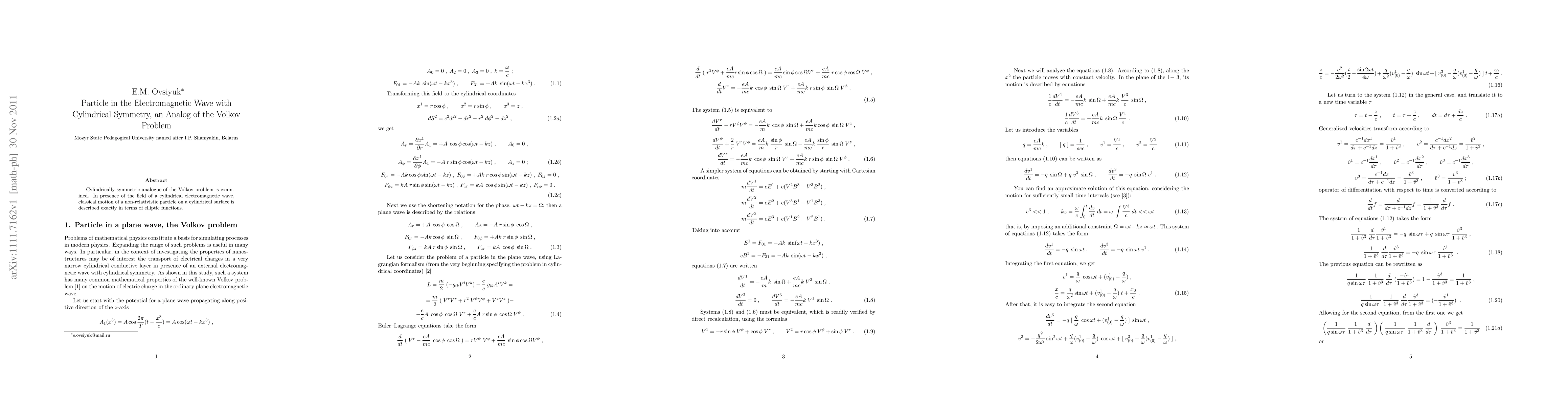 Summary: This paper investigates the classical motion of a non-relativistic particle in a cylindrical electromagnetic wave, providing an exact solution in terms of elliptic functions, analogous to the Volkov problem in cylindrical symmetry.