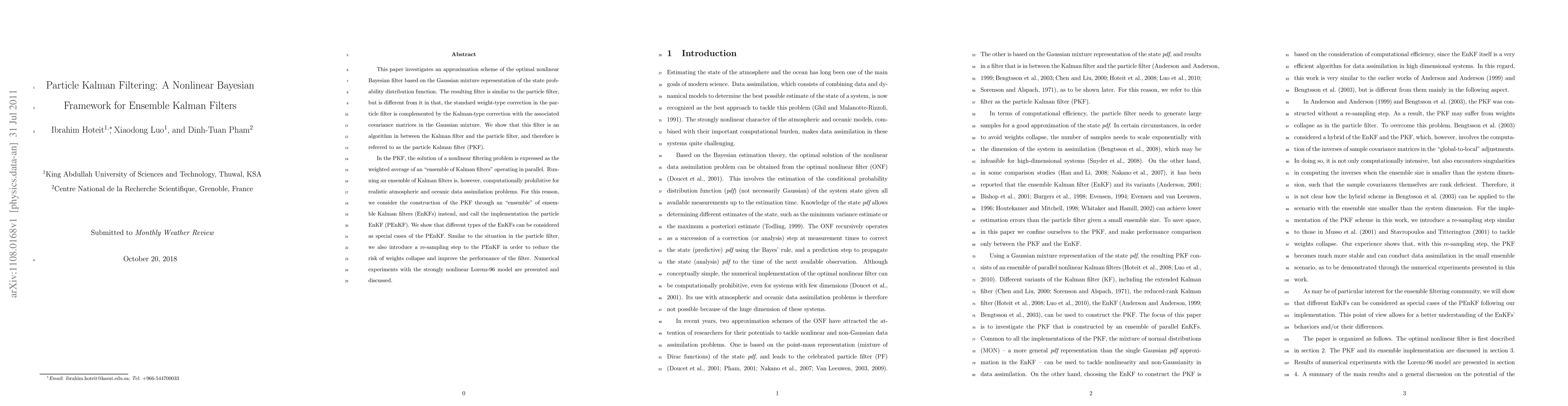 This paper proposes a particle Kalman filter (PKF) as a hybrid between the Kalman filter and particle filter, utilizing an ensemble of Kalman filters for practical implementation. The resulting particle EnKF (PEnKF) incorporates re-sampling to mitigate weight collapse, and is demonstrated through numerical experiments on the Lorenz-96 model.