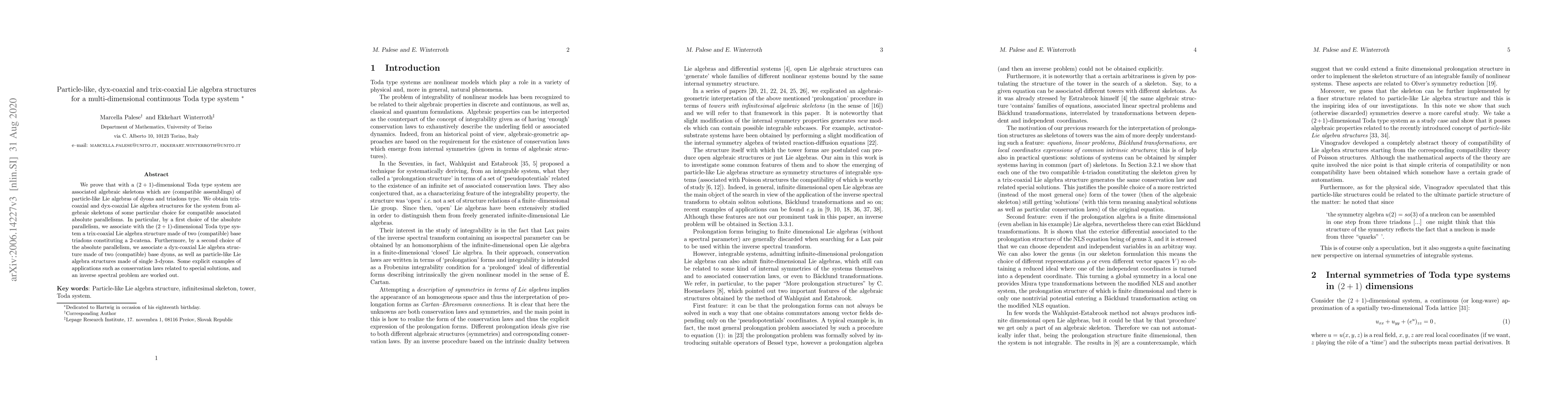 We prove that with a $(2+1)$-dimensional Toda type system are associated algebraic skeletons which are (compatible assemblings) of particle-like Lie algebras of dyons and triadons type. We obtain trix-coaxial and dyx-coaxial Lie algebra structures for the system from algebraic skeletons of some particular choice for compatible associated absolute parallelisms. In particular, by a first choice of the absolute parallelism, we associate with the $(2+1)$-dimensional Toda type system a trix-coaxial Lie algebra structure made of two (compatible) base triadons constituting a $2$-catena. Furthermore, by a second choice of the absolute parallelism, we associate a dyx-coaxial Lie algebra structure made of two (compatible) base dyons, as well as particle-like Lie algebra structures made of single $3$-dyons. Some explicit examples of applications such as conservation laws related to special solutions, and an inverse spectral problem are worked out.