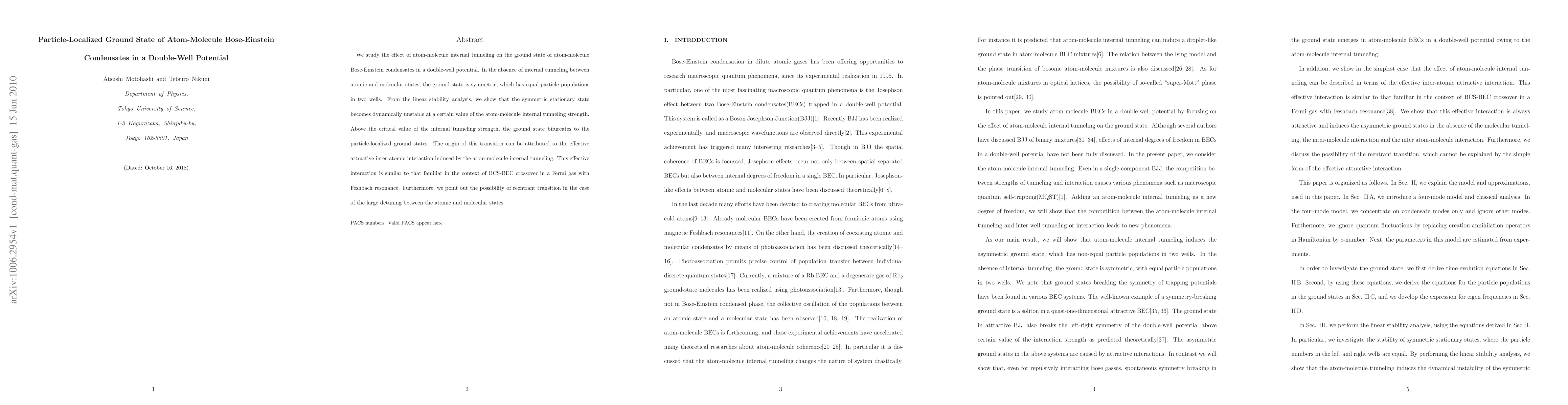 This paper investigates how atom-molecule internal tunneling affects the ground state of atom-molecule Bose-Einstein condensates in a double-well potential, revealing a transition from symmetric to particle-localized ground states due to effective attractive inter-atomic interactions induced by the tunneling. It also discusses the potential for a reentrant transition under large detuning.