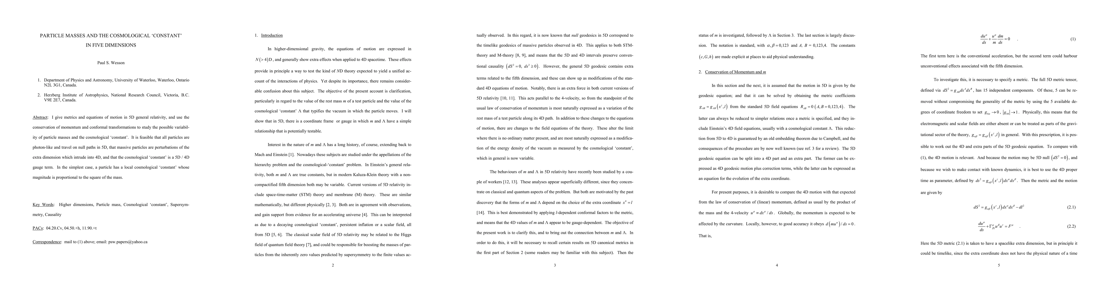 I give metrics and equations of motion in 5D general relativity, and use the conservation of momentum and conformal transformations to study the possible variability of particle masses and the cosmological 'constant'. It is feasible that all particles are photon-like and travel on null paths in 5D, that massive particles are perturbations of the extra dimension which intrude into 4D, and that the cosmological 'constant' is a 5D / 4D gauge term. In the simplest case, a particle has a local cosmological 'constant' whose magnitude is proportional to the square of the mass.
