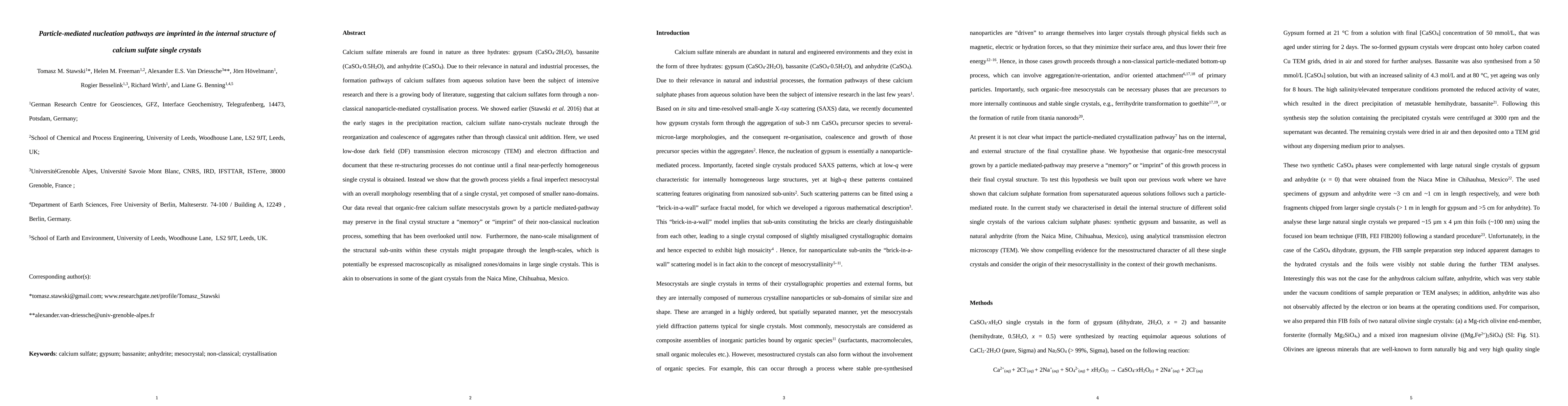 Calcium sulfate minerals are found under the form of three crystalline phases: gypsum (CaSO4.2H2O), bassanite (CaSO4.0.5H2O), and anhydrite (CaSO4). Due to its relevance in natural and industrial processes, the formation pathways of these calcium sulphate phases from aqueous solution have been the subject of intensive research. There is a growing body of literature, that calcium sulfate forms essentially through a non-classical nanoparticle- or cluster-mediated crystallisation process. At the early stages of precipitation calcium sulfate crystals grow through the reorganization and coalescence of aggregates rather than through classical unit addition. Here, we show by using low-dose dark field (DF) transmission electron microscopy (TEM) and electron diffraction, that these re-structuring processes by no means continue until a near-perfectly homogeneous single crystal is obtained. Instead the growth process yields a final imperfect mesocrystal of the overall morphology resembling that of a single crystal, yet composed of smaller nano-domains. Hence, our data indicate that organic-free mesocrystal grown by a particle mediated-pathway may preserve a 'memory or 'imprint' of the non-classical growth process in the final crystal structure, something that has been largely overlooked until now. Furthermore, the nano-scale misalignment of the structural sub-units within crystals might propagate through the length-scales, and potentially is expressed macroscopically as misaligned zones/domains in large single crystals, e.g. as those observed in some of the giant crystals from the Naica Mine, Chihuahua, Mexico.