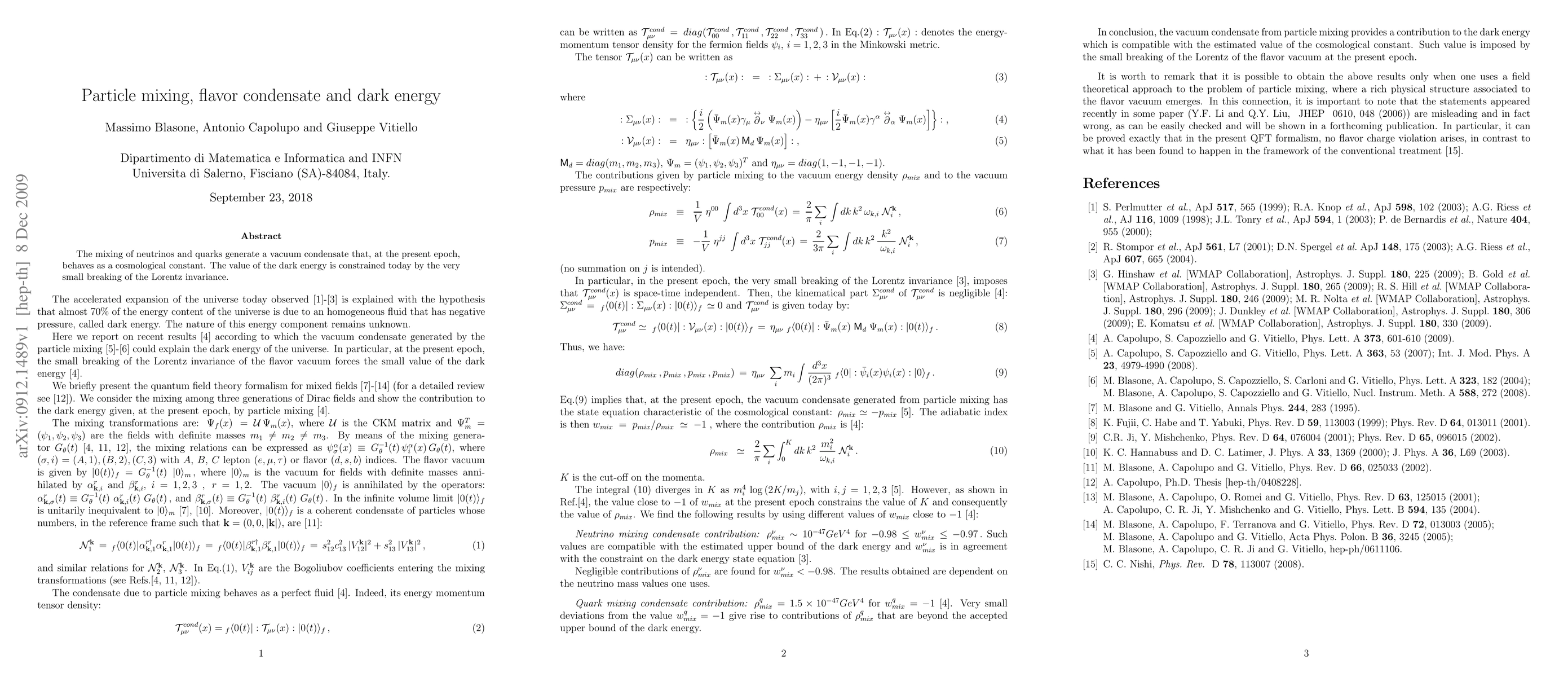 Summary: This paper proposes that neutrino and quark mixing produces a vacuum condensate acting as dark energy, with its value today constrained by the slight violation of Lorentz invariance. The condensate's behavior mimics a cosmological constant.