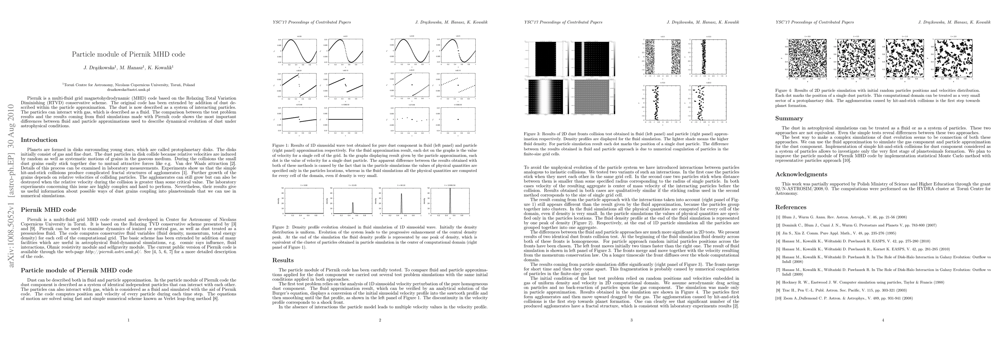 A new particle module has been added to the Piernik MHD code to simulate dust as a system of interacting particles, showing differences between fluid and particle approximations in describing astrophysical dust evolution.