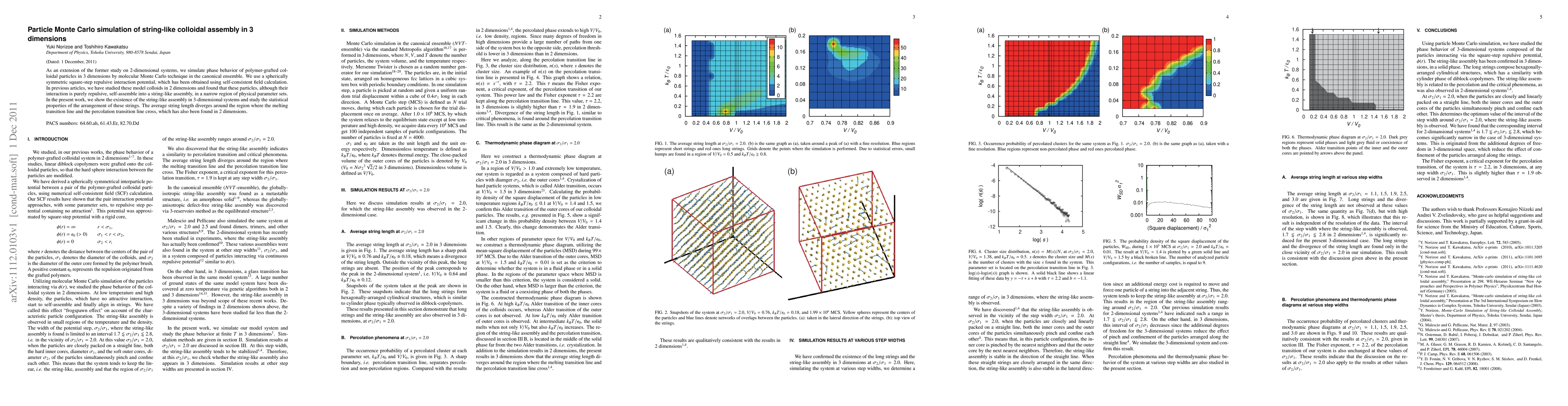 This paper extends previous 2D studies to 3D, using Monte Carlo simulations to investigate the phase behavior of polymer-grafted colloidal particles. It confirms the existence of string-like assemblies in 3D and finds that average string length diverges at the intersection of melting and percolation transition lines.