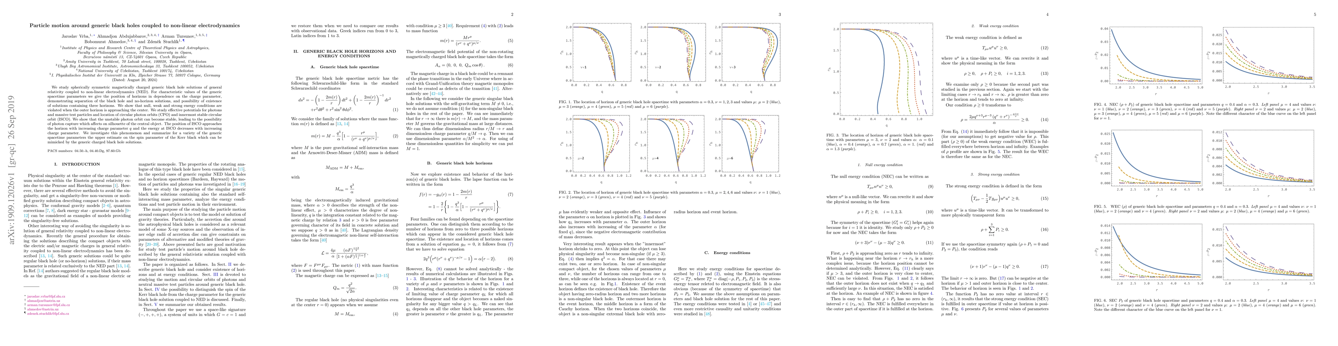 We study spherically symmetric magnetically charged generic black hole solutions of general relativity coupled to non-linear electrodynamics (NED). For characteristic values of the generic spacetime parameters we give the position of horizons in dependence on the charge parameter, demonstrating separation of the black hole and no-horizon solutions, and possibility of existence of solutions containing three horizons. We show that null, weak and strong energy conditions are violated when the outer horizon is approaching the center. We study effective potentials for photons and massive test particles and location of circular photon orbits (CPO) and innermost stable circular orbit (ISCO). We show that the unstable photon orbit can become stable, leading to the possibility of photon capture which affects on silhouette of the central object. The position of ISCO approaches the horizon with increasing charge parameter q and the energy at ISCO decreases with increasing charge parameter. We investigate this phenomenon and summarize for a variety of the generic spacetime parameters the upper estimate on the spin parameter of the Kerr black which can be mimicked by the generic charged black hole solutions.