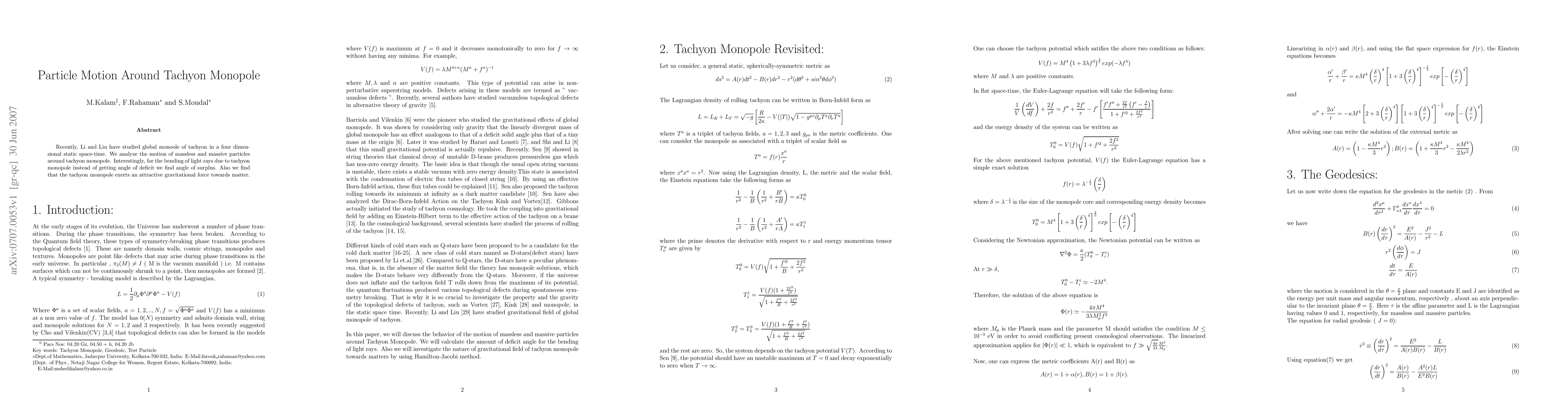 Summary: This paper investigates the motion of particles around a tachyon monopole in four-dimensional static space-time, revealing an unusual gravitational attraction and an angle of surplus in light bending, contrary to the expected angle of deficit.