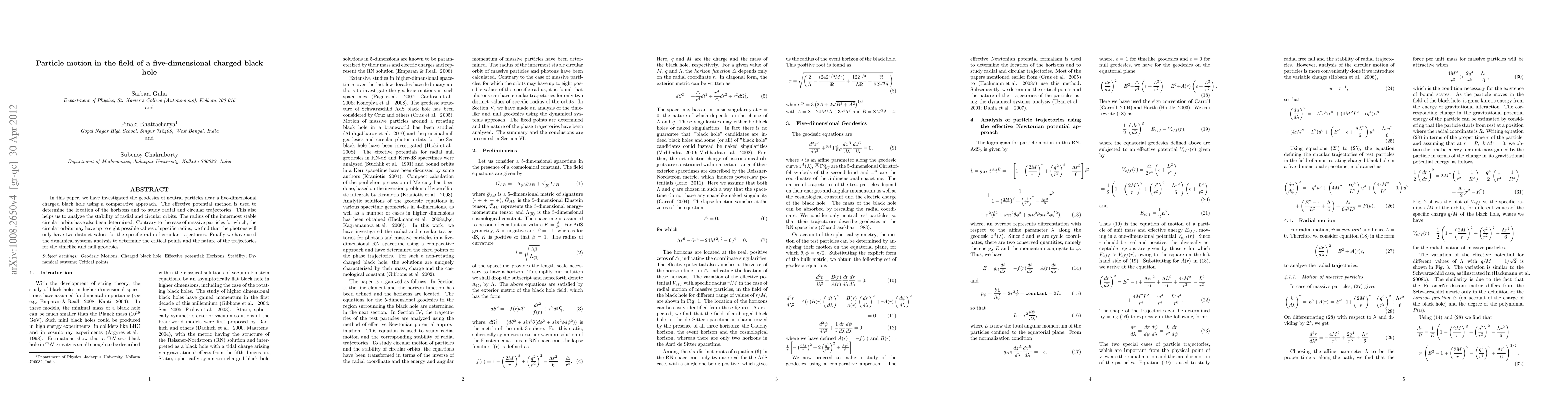 In this paper, we have investigated the geodesics of neutral particles near a five-dimensional charged black hole using a comparative approach. The effective potential method is used to determine the location of the horizons and to study radial and circular trajectories. This also helps us to analyze the stability of radial and circular orbits. The radius of the innermost stable circular orbits have also been determined. Contrary to the case of massive particles for which, the circular orbits may have up to eight possible values of specific radius, we find that the photons will only have two distinct values for the specific radii of circular trajectories. Finally we have used the dynamical systems analysis to determine the critical points and the nature of the trajectories for the timelike and null geodesics.