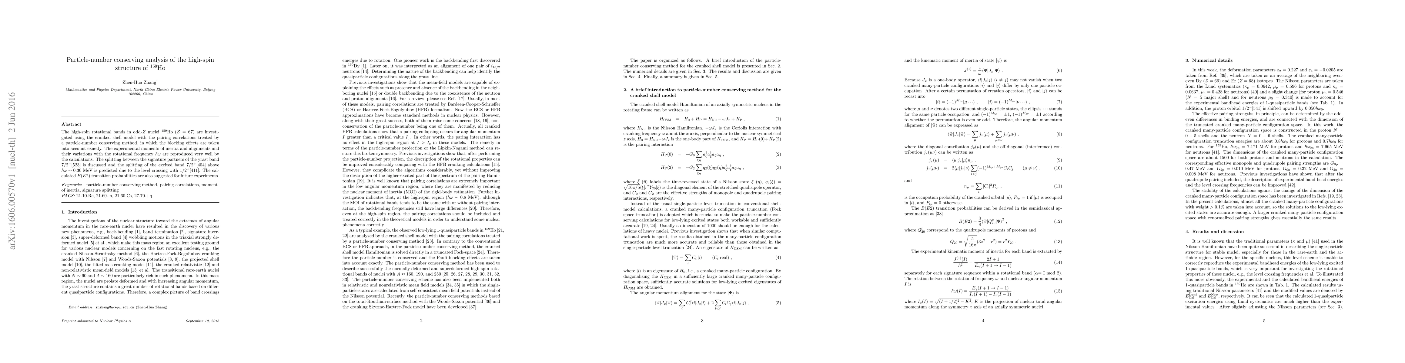 The high-spin rotational bands in odd-$Z$ nuclei $^{159}$Ho ($Z=67$) are investigated using the cranked shell model with the pairing correlations treated by a particle-number conserving method, in which the blocking effects are taken into account exactly. The experimental moments of inertia and alignments and their variations with the rotational frequency $\hbar\omega$ are reproduced very well by the calculations. The splitting between the signature partners of the yrast band $7/2^-[523]$ is discussed and the splitting of the excited band $7/2^+[404]$ above $\hbar\omega \sim 0.30$~MeV is predicted due to the level crossing with $1/2^+[411]$. The calculated $B(E2)$ transition probabilities are also suggested for future experiments.