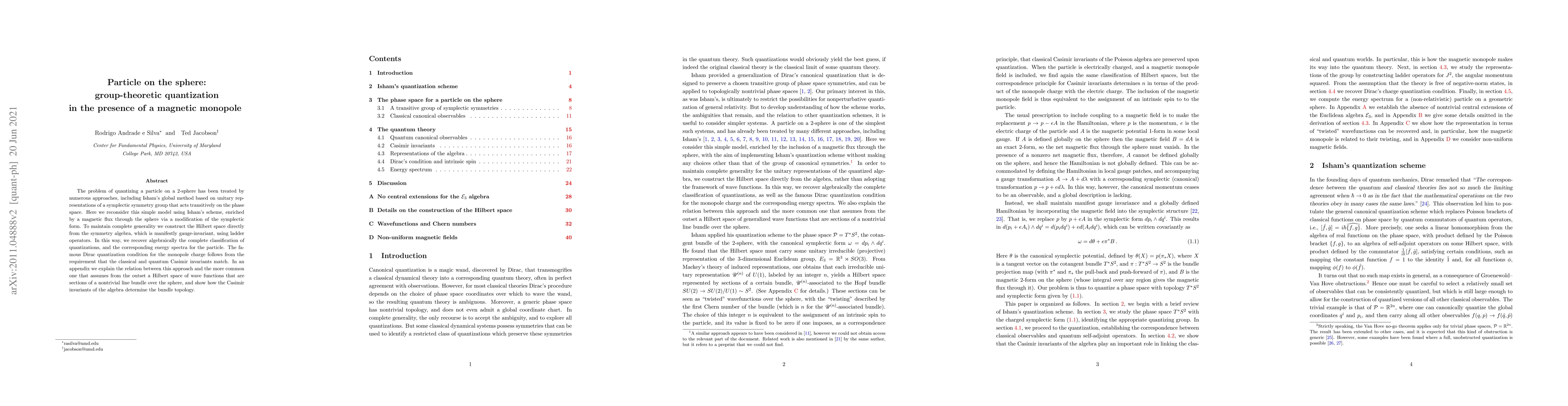 The problem of quantizing a particle on a 2-sphere has been treated by numerous approaches, including Isham's global method based on unitary representations of a symplectic symmetry group that acts transitively on the phase space. Here we reconsider this simple model using Isham's scheme, enriched by a magnetic flux through the sphere via a modification of the symplectic form. To maintain complete generality we construct the Hilbert space directly from the symmetry algebra, which is manifestly gauge-invariant, using ladder operators. In this way, we recover algebraically the complete classification of quantizations, and the corresponding energy spectra for the particle. The famous Dirac quantization condition for the monopole charge follows from the requirement that the classical and quantum Casimir invariants match. In an appendix we explain the relation between this approach and the more common one that assumes from the outset a Hilbert space of wave functions that are sections of a nontrivial line bundle over the sphere, and show how the Casimir invariants of the algebra determine the bundle topology.