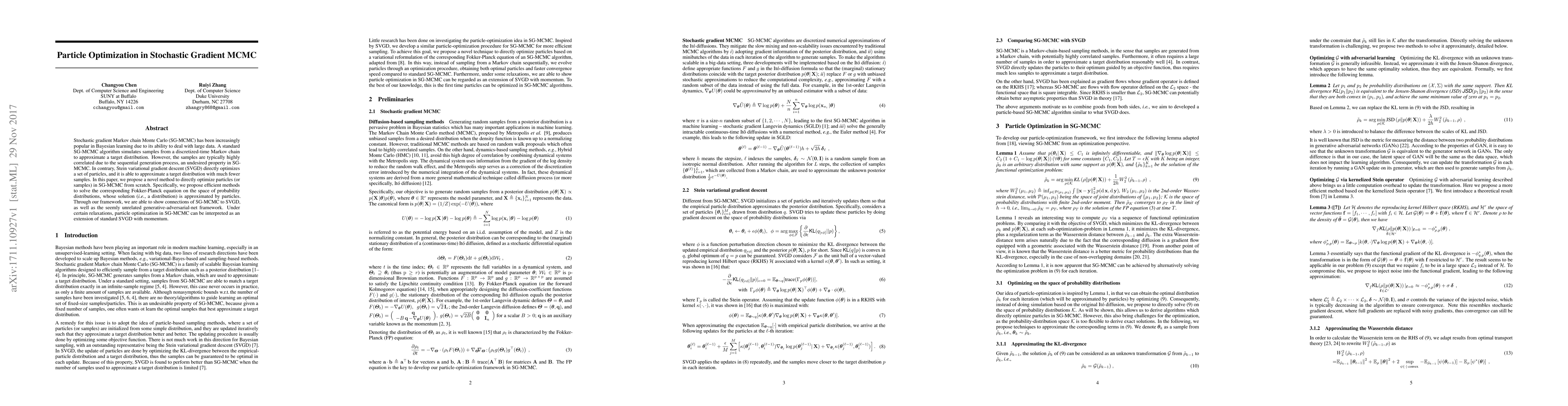 This paper proposes a novel method for directly optimizing particles in stochastic gradient Markov chain Monte Carlo (SG-MCMC) to improve sample efficiency and reduce correlation. It connects SG-MCMC to Stein variational gradient descent (SVGD) and generative adversarial networks, showing that particle optimization can be viewed as an extended SVGD with momentum.