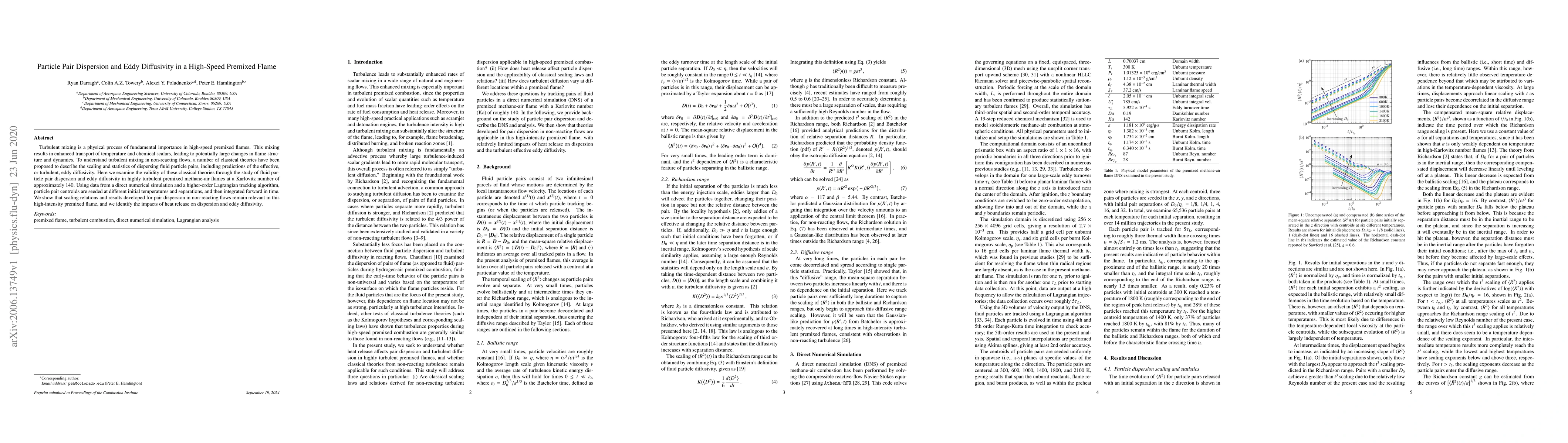 This study investigates the dispersion of particle pairs and eddy diffusivity in highly turbulent premixed methane-air flames, confirming that classical theories for non-reacting flows apply, while also highlighting the effects of heat release on these parameters. The research uses direct numerical simulation and Lagrangian tracking to analyze flame dynamics.