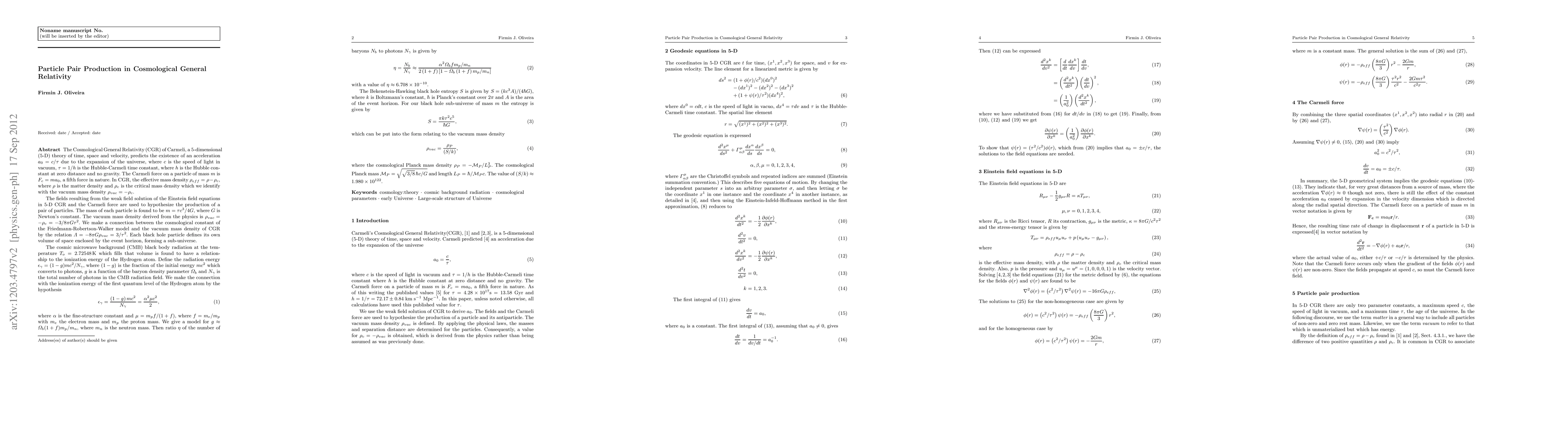 The Cosmological General Relativity (CGR) of Carmeli, a 5-dimensional (5-D) theory of time, space and velocity, predicts the existence of an acceleration a_0 = c / tau due to the expansion of the universe, where c is the speed of light in vacuum, tau = 1 / h is the Hubble-Carmeli time constant, where h is the Hubble constant at zero distance and no gravity. The Carmeli force on a particle of mass m is F_c = m a_0, a fifth force in nature. In CGR, the effective mass density rho_eff = rho - rho_c, where rho is the matter density and rho_c is the critical mass density which we identify with the vacuum mass density rho_vac = -rho_c. The fields resulting from the weak field solution of the Einstein field equations in 5-D CGR and the Carmeli force are used to hypothesize the production of a pair of particles. The mass of each particle is found to be m = tau c^3 / 4 G, where G is Newton's constant. The vacuum mass density derived from the physics is rho_vac = -rho_c = -3 / (8 pi G tau^2). The cosmic microwave background (CMB) black body radiation at the temperature T_o = 2.72548 K which fills that volume is found to have a relationship to the ionization energy of the Hydrogen atom. Define the radiation energy epsilon_gamma = (1 - g) m c^2 / N_gamma, where (1-g) is the fraction of the initial energy m c^2 which converts to photons, g is a function of the baryon density parameter Omega_b and N_gamma is the total number of photons in the CMB radiation field. We make the connection with the ionization energy of the first quantum level of the Hydrogen atom by the hypothesis epsilon_gamma = [(1 - g) m c^2] / N_gamma = alpha^2 mu c^2 / 2, where alpha is the fine-structure constant and mu = m_p f / (1 + f), where f= m_e / m_p with m_e the electron mass and m_p the proton mass.